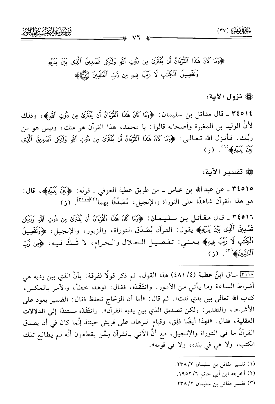 ٣٤٥١٦ - قال مقاتل بن سليمان: {وما كانَ هذا القُرْآنُ أنْ يُفْتَرى مِن دُونِ اللَّهِ ولكِنْ تَصْدِيقَ الَّذِي بَيْنَ يَدَيْهِ} يقول: القرآن يُصَدِّق التوراة، والزبور، والإنجيل، {وتَفْصِيلَ الكِتابِ لا رَيْبَ فِيهِ} يعني: تفصيل الحلال والحرام، لا شَكَّ فيه، {مِن رَبِّ العالَمِينَ} (¬٣). (ز)