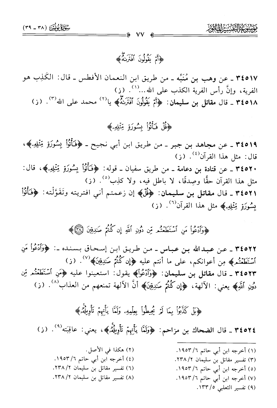 ٣٤٥٢٠ - عن قتادة بن دعامة -من طريق سفيان- قوله: {فأتوا بسورة مثله}، قال: مثل هذا القرآن حقًّا وصِدقًا، لا باطل فيه، ولا كذِب (¬٥). (ز)