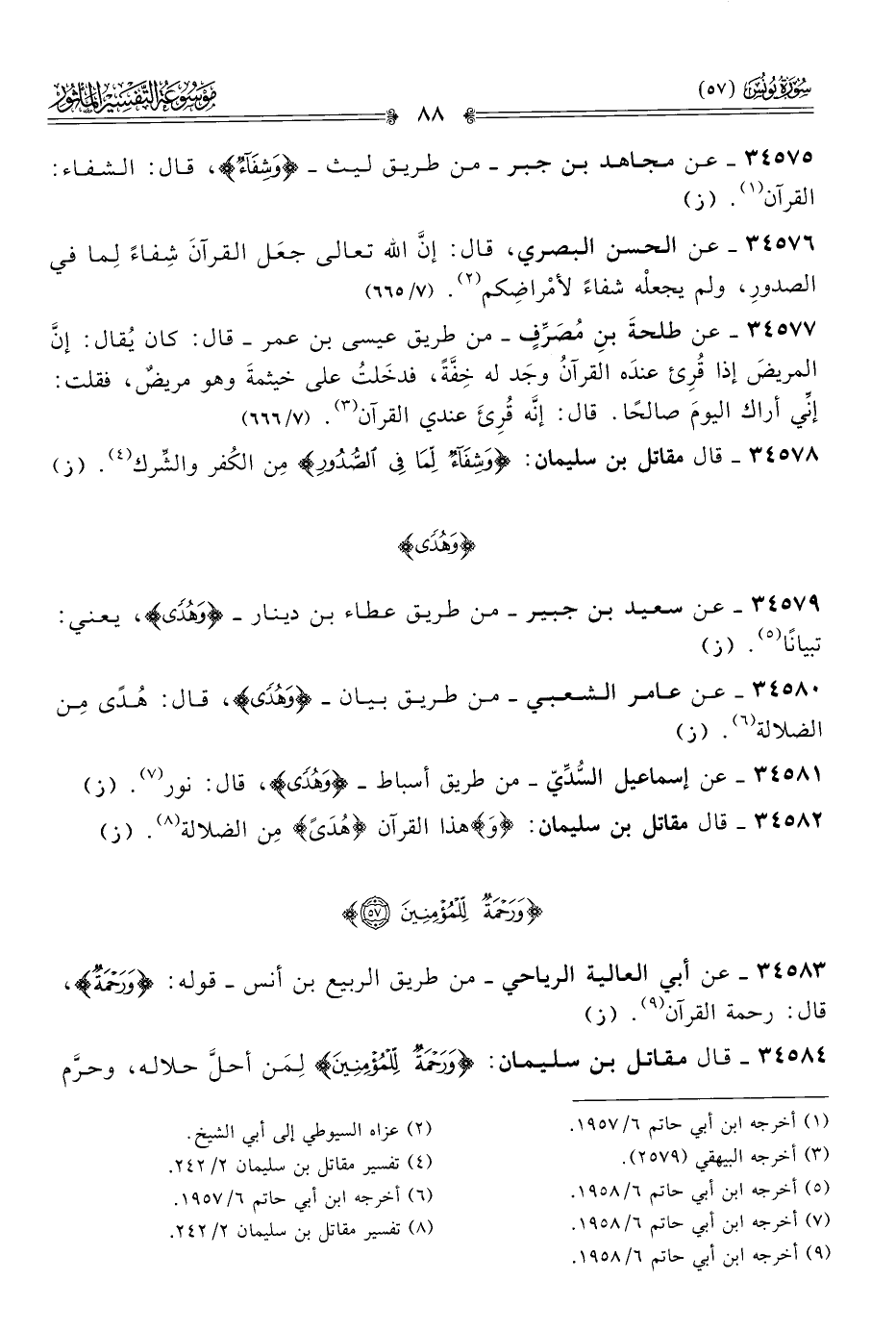 ٣٤٥٨٤ - قال مقاتل بن سليمان: {ورَحْمَةٌ لِلْمُؤْمِنِينَ} لِمَن أحلَّ حلاله، وحرَّم