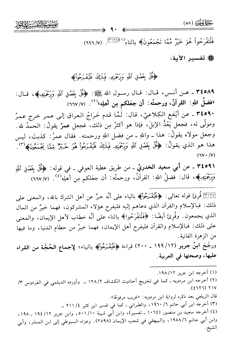٣٤٥٩١ - عن أبي سعيد الخدريِّ -من طريق عطية العوفي- في قوله: {قُلْ بِفَضْلِ الله وبِرَحْمَتِه}، قال: فضلُ اللهِ: القرآنُ، ورحمتُه: أن جعَلكم مِن أهلِه (¬٤). (٧/ ٦٦٧)