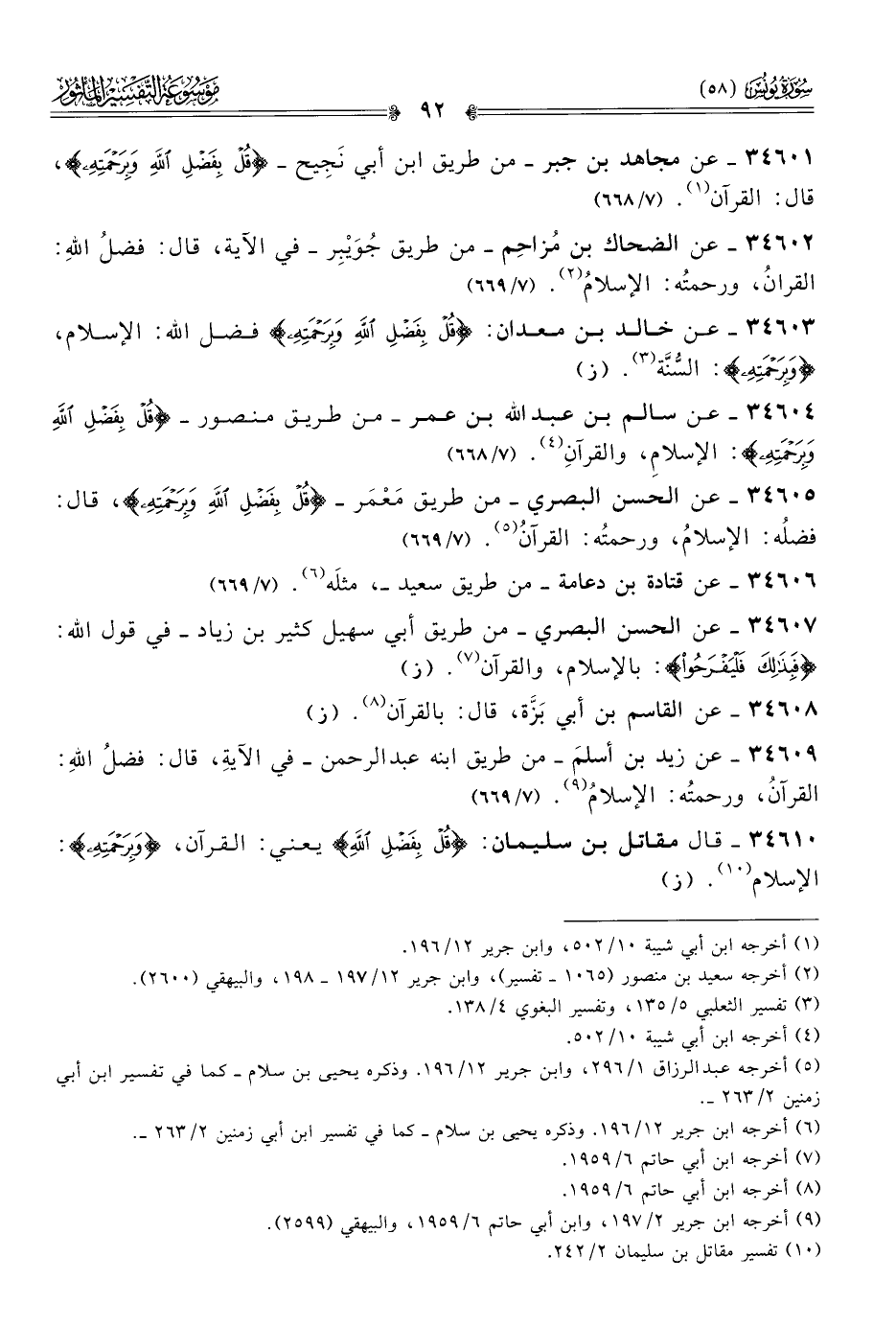 ٣٤٦٠٤ - عن سالم بن عبد الله بن عمر -من طريق منصور- {قُلْ بِفَضْلِ الله وبِرَحْمَتِه}: الإسلامِ، والقرآنِ (¬٤). (٧/ ٦٦٨)