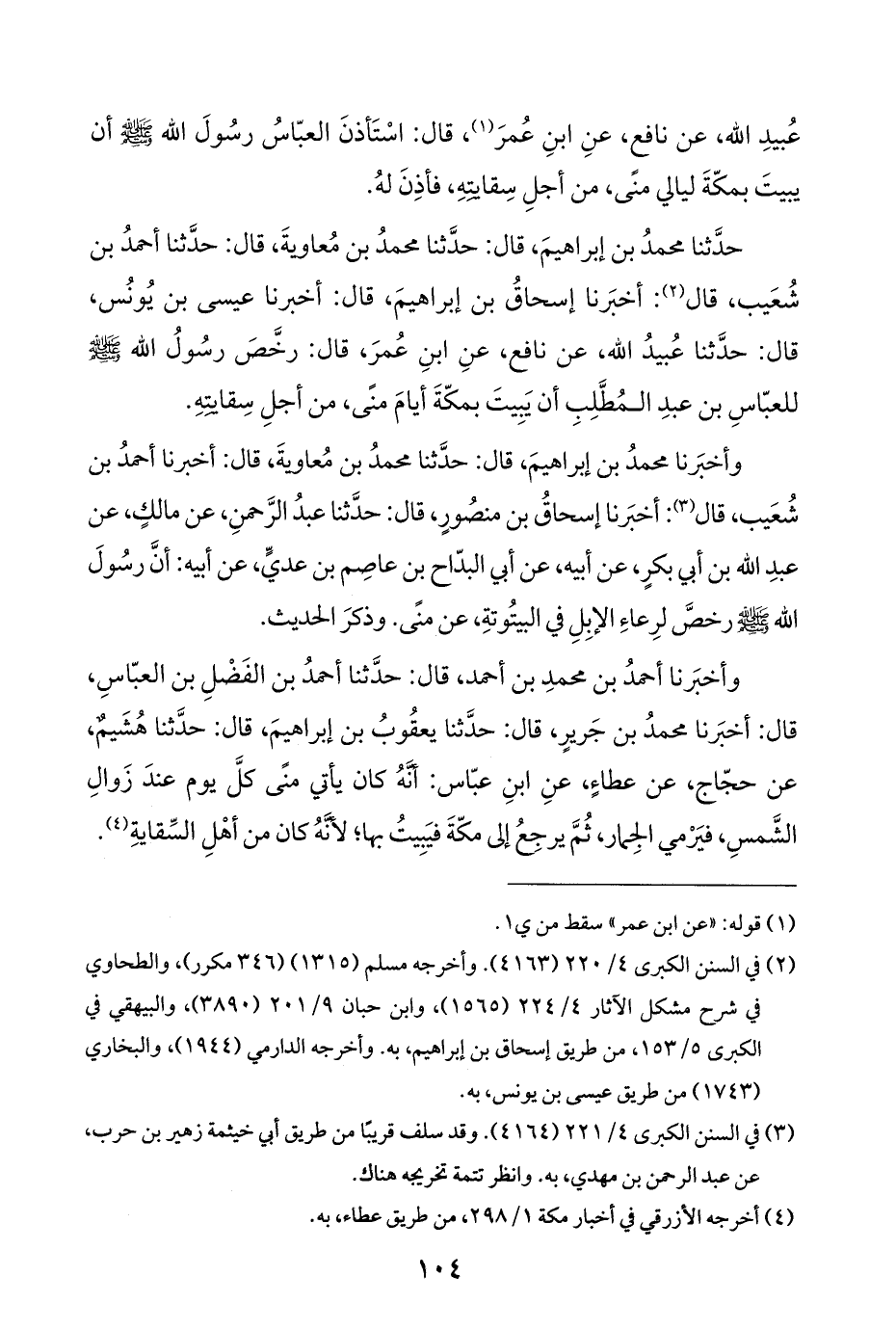 حدَّثنا محمدُ بن إبراهيمَ، قال: حدَّثنا محمدُ بن مُعاويةَ، قال: حدَّثنا أحمدُ بن شُعَيب، قال (¬٢): أخبَرنا إسحاقُ بن إبراهيمَ، قال: أخبرنا عيسى بن يُونُس، قال: حدَّثنا عُبيدُ اللَّه، عن نافع، عنِ ابنِ عُمرَ، قال: رخَّصَ رسولُ اللَّه -صلى اللَّه عليه وسلم- للعبّاسِ بن عبدِ المُطَّلِبِ أن يَبِيتَ بمكّةَ أيامَ منًى، من أجلِ سِقايتِهِ.