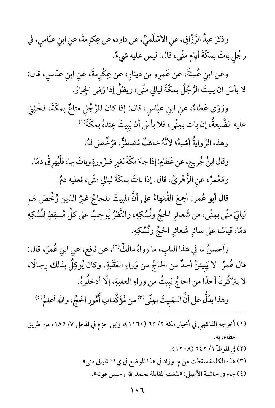 ورَوَى عَطاءٌ، عنِ ابنِ عبّاسٍ، قال: إذا كان للرَّجُلِ متاعٌ بمكّةَ، فخَشِيَ عليه الضَّيعةُ، إن بات بمِنًى، فلا بأسَ أن يَبِيتَ عِندهُ بمكّةَ (¬١).