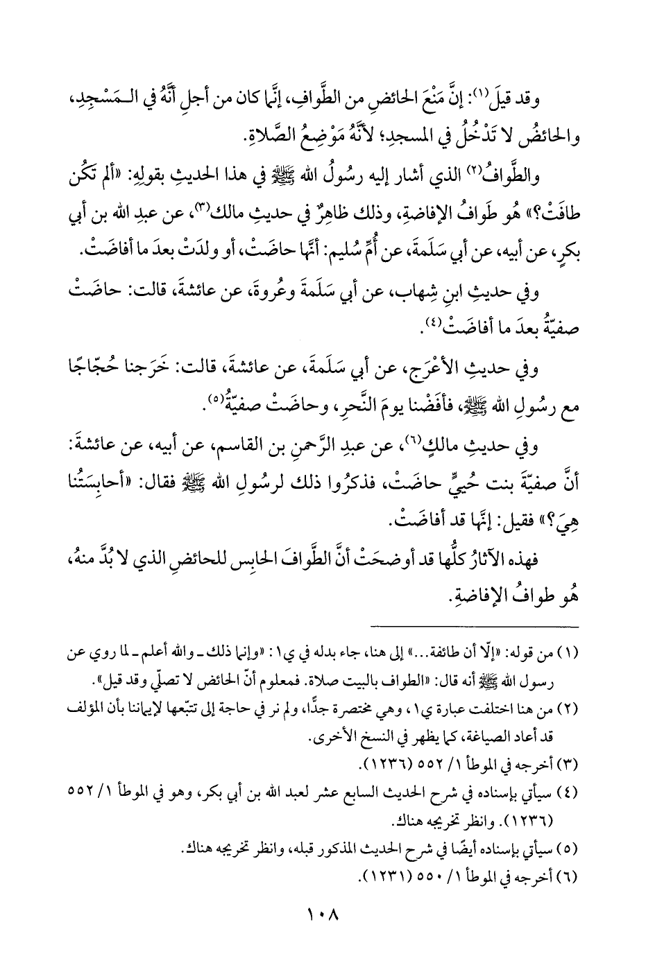 والطَّوافُ (¬٢) الذي أشار إليه رسُولُ اللَّه -صلى اللَّه عليه وسلم- في هذا الحديثِ بقولِهِ: "ألم تَكُن طافَتْ؟ " هُو طَوافُ الإفاضةِ، وذلك ظاهِرٌ في حديثِ مالك (¬٣)، عن عبدِ اللَّه بن أبي بكرٍ، عن أبيه، عن أبي سَلَمةَ، عن أُمِّ سُليم: أنَّها حاضَتْ، أو ولدَتْ بعدَ ما أفاضَتْ.