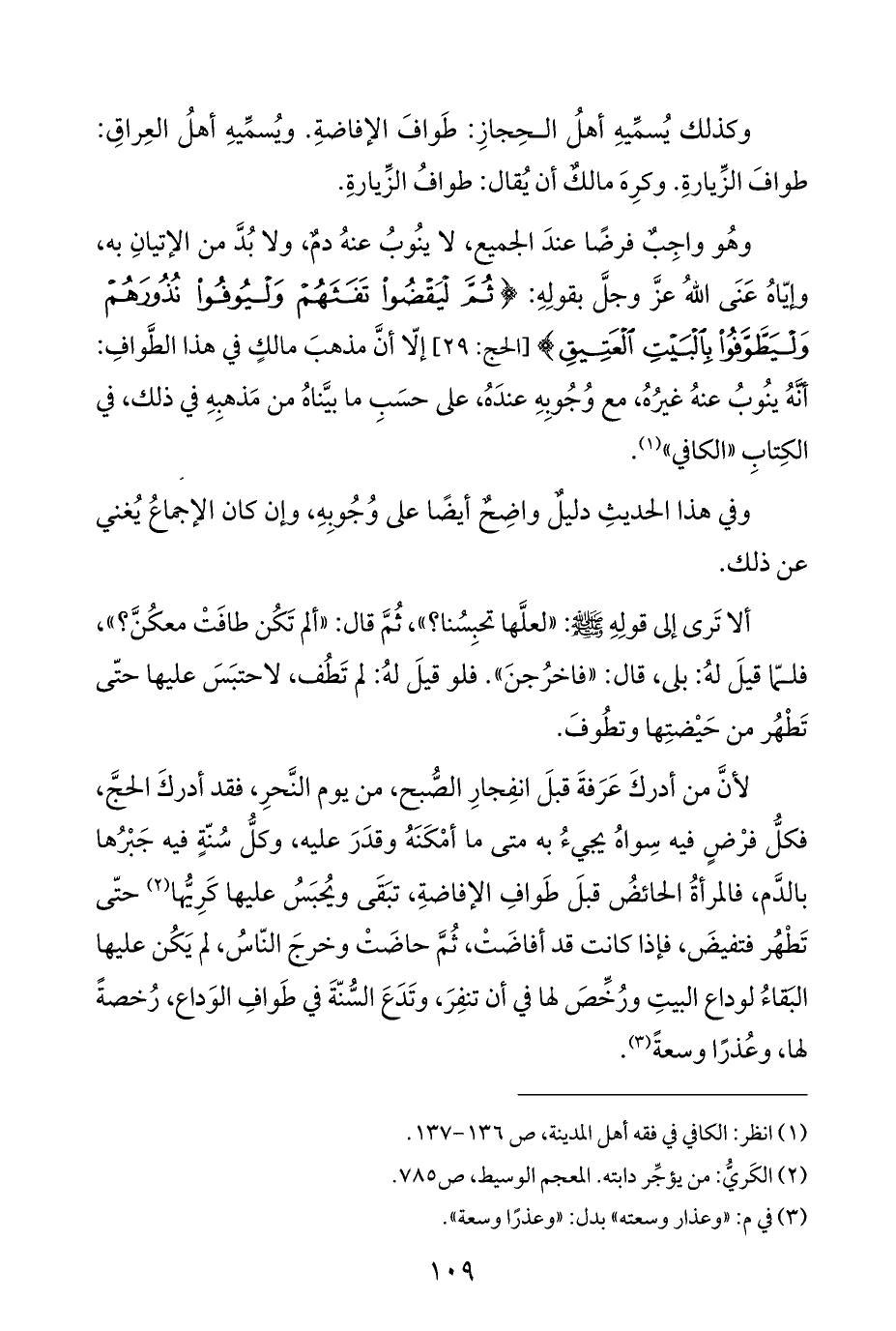 لأنَّ من أدركَ عَرَفةَ قبلَ انفِجارِ الصُّبح، من يوم النَّحرِ، فقد أدركَ الحجَّ، فكلُّ فرْضٍ فيه سِواهُ يجيءُ به متى ما أمْكَنَهُ وقدَرَ عليه، وكلُّ سُنّةٍ فيه جَبْرُها بالدَّم، فالمرأةُ الحائضُ قبلَ طَوافِ الإفاضةِ، تبَقَى ويُحبَسُ عليها كَرِيُّها (¬٢) حتّى تَطْهُر فتفيضَ، فإذا كانت قد أفاضَتْ، ثُمَّ حاضَتْ وخرجَ النّاسُ، لم يَكُن عليها التقاءُ لوداع البيتِ ورُخِّصَ لها في أن تنفِرَ، وتَدَعَ السُّنّةَ في طَوافِ الوَداع، رُخصةً لها، وعُذرًا وسعةً (¬٣).