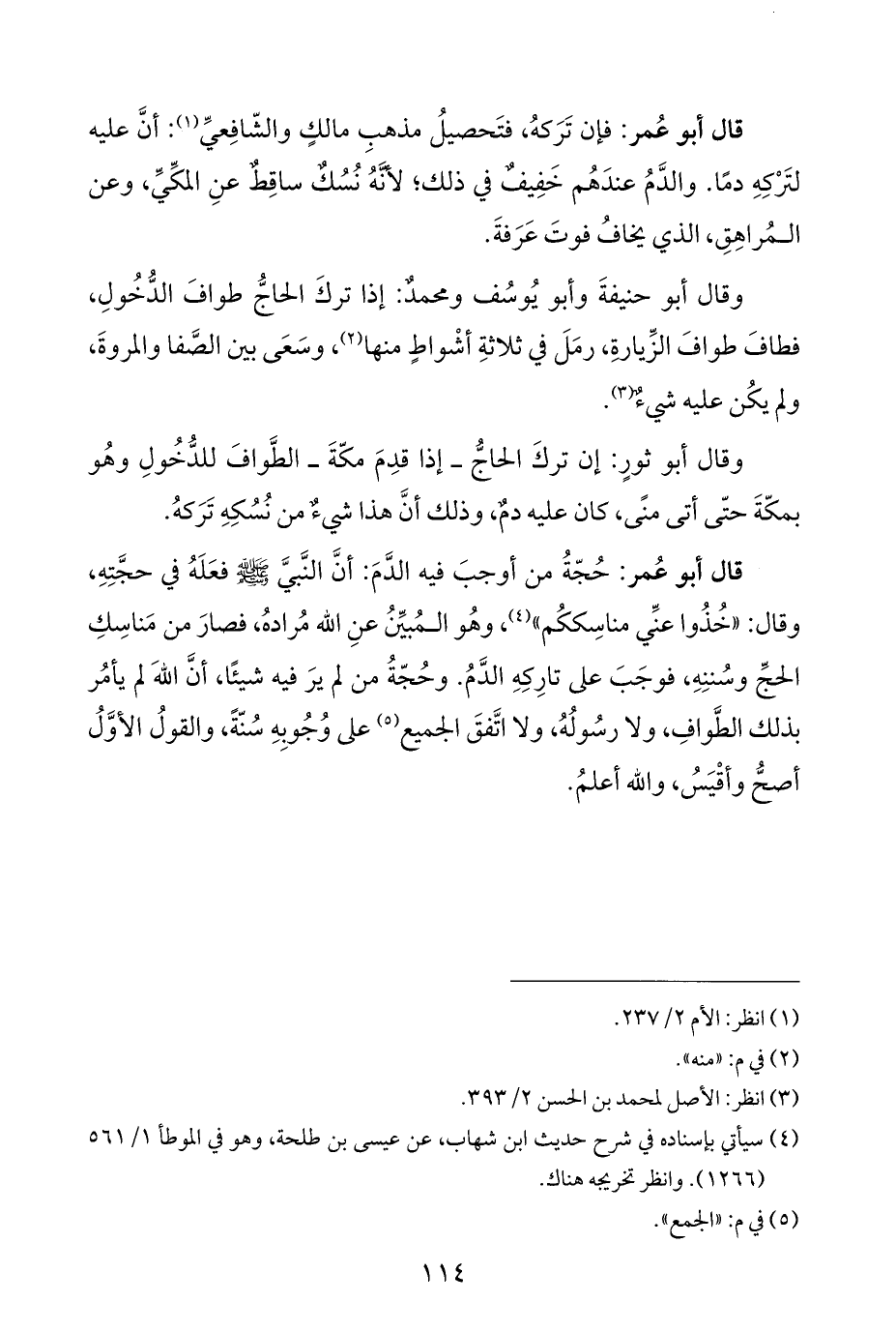 قال أبو عُمر: فإن تَرَكهُ، فتَحصيلُ مذهبِ مالكٍ والشّافِعيِّ (¬١): أنَّ عليه لتَرْكِهِ دمًا. والدَّمُ عندَهُم خَفِيفٌ في ذلك؛ لأنَّهُ نُسُكٌ ساقِطٌ عنِ المكِّيِّ، وعن المُراهِقِ، الذي يخافُ فوتَ عَرَفةَ.
