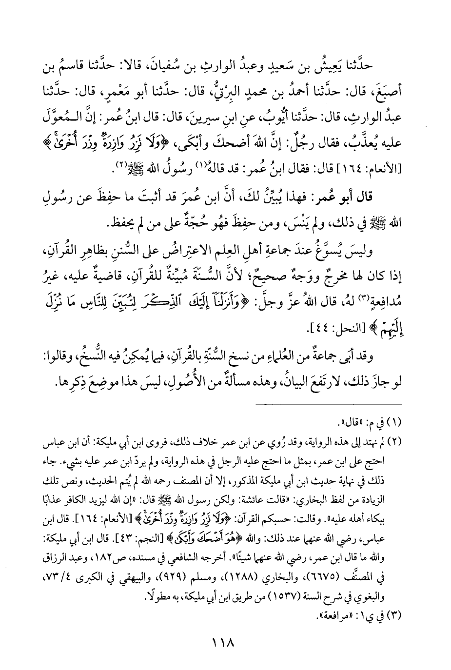 حدَّثنا يَعِيشُ بن سَعيدٍ وعبدُ الوارثِ بن سُفيانَ، قالا: حدَّثنا قاسمُ بن أصبَغَ، قال: حدَّثنا أحمدُ بن محمدٍ البِرْتيُّ، قال: حدَّثنا أبو مَعْمرٍ، قال: حدَّثنا عبدُ الوارثِ، قال: حدَّثنا أيُّوبُ، عنِ ابنِ سيرينَ، قال: قال ابنُ عُمر: إنَّ المُعوَّلَ عليه يُعذَّبُ، فقال رجُلٌ: إنَّ اللَّهَ أضحكَ وأبْكَى، {وَلَا تَزِرُ وَازِرَةٌ وِزْرَ أُخْرَى} [الأنعام: ١٦٤] قال: فقال ابنُ عُمر: قد قالهُ (¬١) رسُولُ اللَّه -صلى اللَّه عليه وسلم- (¬٢).