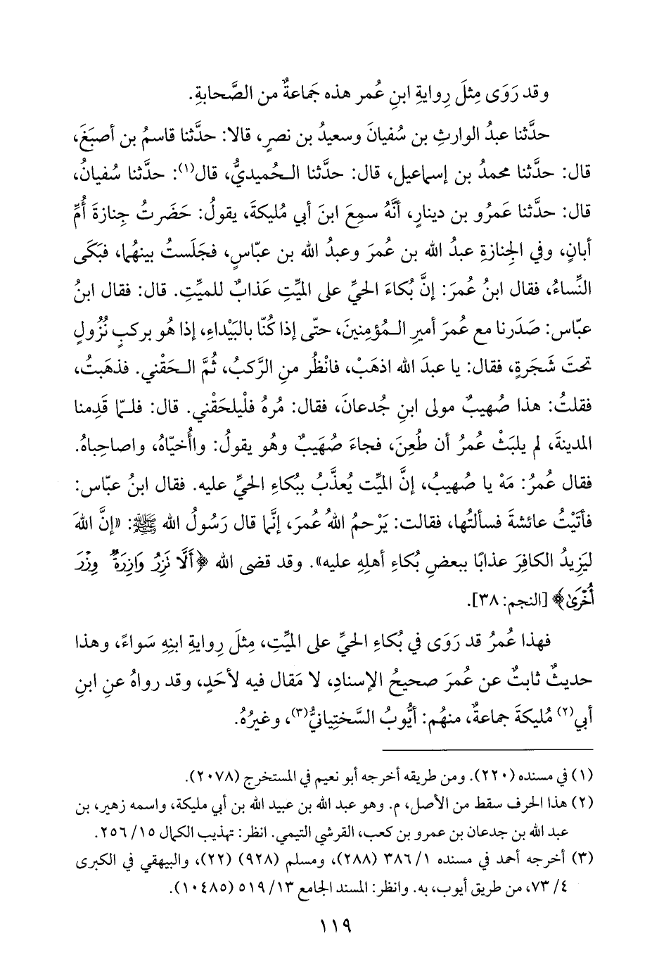 حدَّثنا عبدُ الوارثِ بن سُفيانَ وسعيدُ بن نصرٍ، قالا: حدَّثنا قاسمُ بن أصبَغَ، قال: حدَّثنا محمدُ بن إسماعيل، قال: حدَّثنا الحُميديُّ، قال (¬١): حدَّثنا سُفيانُ، قال: حدَّثنا عَمرُو بن دينارٍ، أَنَّهُ سمِعَ ابنَ أبي مُليكةَ، يقولُ: حَضَرتُ جِنازةَ أُمِّ أبانٍ، وفي الجِنازةِ عبدُ اللَّه بن عُمرَ وعبدُ اللَّه بن عبّاسٍ، فجَلَستُ بينهُما، فبَكَى النِّساءُ، فقال ابنُ عُمرَ: إنَّ بُكاءَ الحيِّ على الميِّتِ عَذابٌ للميِّتِ. قال: فقال ابنُ عبّاس: صَدَرنا مع عُمرَ أميرِ المُؤمِنينَ، حتّى إذا كُنّا بالبَيْداءِ، إذا هُو بركبٍ نُزُولٍ تحتَ شَجَرةٍ، فقال: يا عبدَ اللَّه اذهَبْ، فانْظُر منِ الرَّكبُ، ثُمَّ الحَقْني. فذهَبتُ، فقلتُ: هذا صُهيبٌ مولى ابنِ جُدعانَ، فقال: مُرهُ فلْيلحَقْني. قال: فلمّا قَدِمنا المدينةَ، لم يلبَثْ عُمرُ أن طُعِنَ، فجاءَ صُهَيبٌ وهُو يقولُ: واأُخيّاهُ، واصاحِباهُ. فقال عُمرُ: مَهْ يا صُهيبُ، إنَّ الميِّت يُعذَّبُ ببُكاءِ الحيِّ عليه. فقال ابنُ عبّاس: فأتَيْتُ عائشةَ فسألتُها، فقالت: يَرْحمُ اللَّهُ عُمرَ، إنَّما قال رَسُولُ اللَّه -صلى اللَّه عليه وسلم-: "إنَّ اللَّهَ ليَزِيدُ الكافِرَ عذابًا ببعضِ بُكاءِ أهلِهِ عليه". وقد قضى اللَّه {أَلَّا تَزِرُ وَازِرَةٌ وِزْرَ أُخْرَى} [النجم: ٣٨].