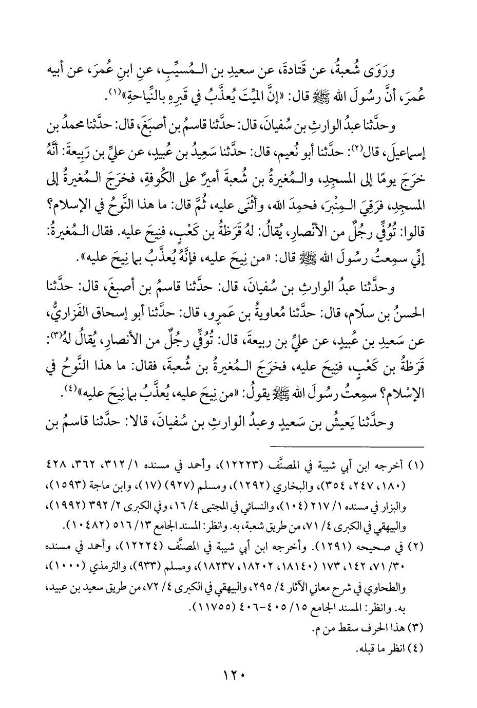 وحدَّثنا عبدُ الوارثِ بن سُفيانَ، قال: حدَّثنا قاسمُ بن أصبغَ، قال: حدَّثنا الحسنُ بن سلّام، قال: حدَّثنا مُعاويةُ بن عَمرٍو، قال: حدَّثنا أبو إسحاق الفَزاريُّ، عن سعيدِ بن عُبيدٍ، عن عليِّ بن ربيعةَ، قال: تُوُفِّي رجُلٌ من الأنصارِ، يُقالُ لهُ (¬٣): قَرَظةُ بن كَعْبٍ، فنِيحَ عليه، فخرَجَ المُغيرةُ بن شُعبةَ، فقال: ما هذا النَّوحُ في الإسْلام؟ سمِعتُ رسُولَ اللَّه -صلى اللَّه عليه وسلم- يقولُ: "من نِيحَ عليه، يُعذَّبُ بما نِيحَ عليه" (¬٤).