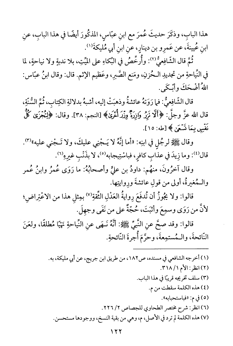 قال الشّافِعيُّ: فما رَوَتهُ عائشةُ وذهبَتْ إليه، أشبهُ بدلالةِ الكِتابِ، ثُمَّ السُّنّةِ، قال اللَّه عزَّ وجلَّ: {أَلَّا تَزِرُ وَازِرَةٌ وِزْرَ أُخْرَى} [النجم: ٣٨]. وقال: {لِتُجْزَى كُلُّ نَفْسٍ بِمَا تَسْعَى} [طه: ١٥].