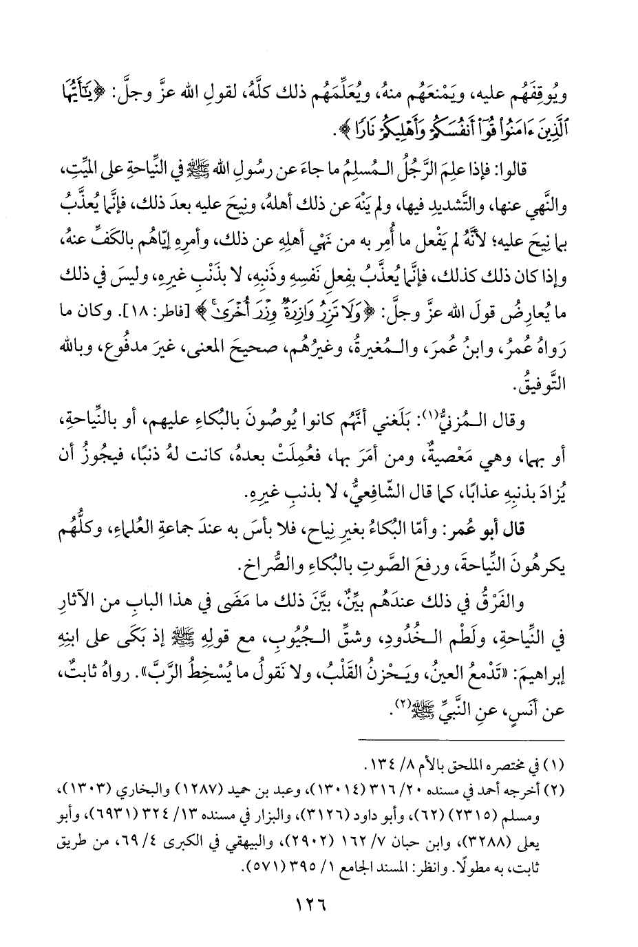 قالوا: فإذا علِمَ الرَّجُلُ المُسلِمُ ما جاءَ عن رسُولِ اللَّه -صلى اللَّه عليه وسلم- في النِّياحةِ على الميِّتِ، والنَّهي عنها، والتَّشديدِ فيها، ولم يَنْهَ عن ذلك أهلهُ، ونِيحَ عليه بعدَ ذلك، فإنَّما يُعذَّبُ بما نِيحَ عليه؛ لأنَّهُ لم يَفْعل ما أُمِر به من نَهْي أهلِهِ عن ذلك، وأمرِهِ إيّاهُم بالكَفِّ عنهُ، وإذا كان ذلك كذلك، فإنَّما يُعذَّبُ بفِعلِ نَفسِهِ وذَنبِهِ، لا بذَنْب غيرِهِ، وليسَ في ذلك ما يُعارِضُ قولَ اللَّه عزَّ وجلَّ: {وَلَا تَزِرُ وَازِرَةٌ وِزْرَ أُخْرَى} [فاطر: ١٨]. وكان ما رَواهُ عُمرُ، وابنُ عُمرَ، والمُغيرةُ، وغيرُهُم، صحيحَ المعنى، غيرَ مدفُوع، وباللَّه التَّوفيقُ.