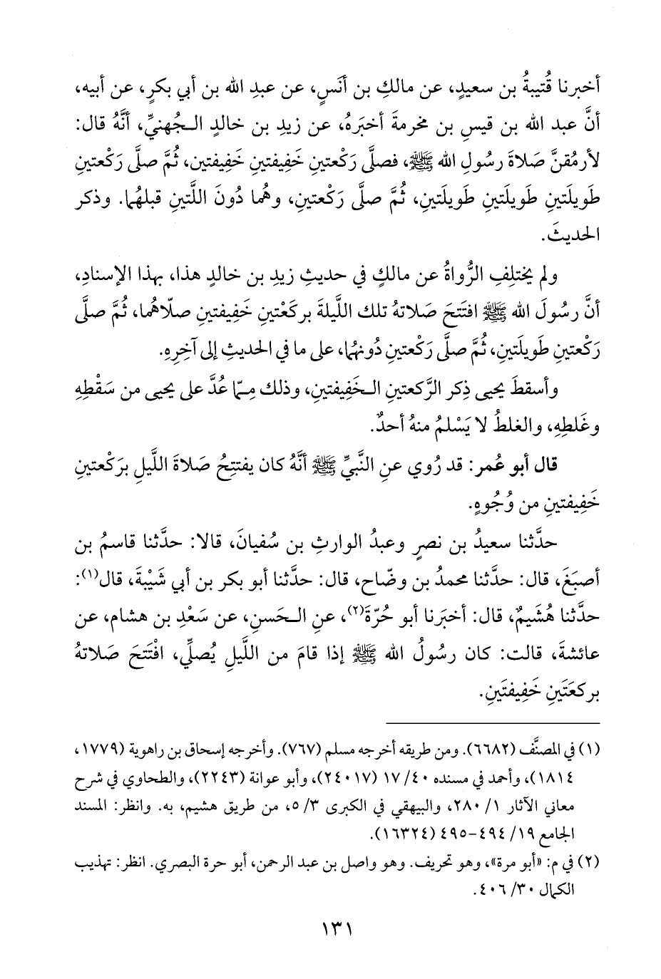 ولم يختلِفِ الرُّواةُ عن مالكٍ في حديثِ زيدِ بن خالدٍ هذا، بهذا الإسنادِ، أنَّ رسُولَ اللَّه -صلى اللَّه عليه وسلم- افتَتحَ صَلاتهُ تلك اللَّيلةَ بركَعْتينِ خَفِيفتينِ صلّاهُما، ثُمَّ صلَّى رَكْعتينِ طَويلَتينِ، ثُمَّ صلَّى رَكْعتينِ دُونهُما، على ما في الحديثِ إلى آخِرِهِ.