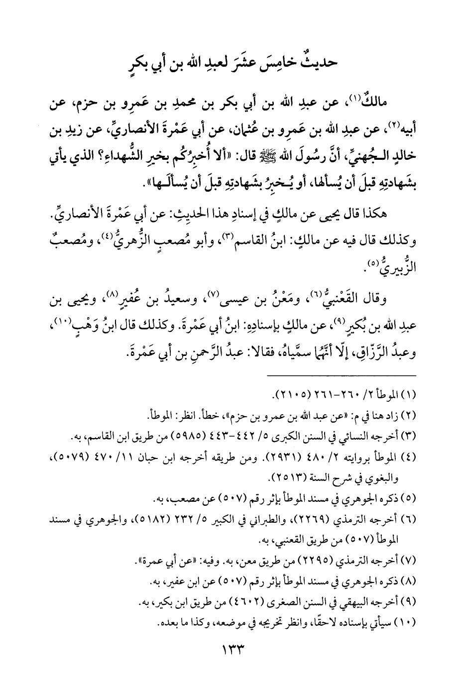 مالكٌ (¬١)، عن عبدِ اللَّه بن أبي بكر بن محمدِ بن عَمرِو بن حزم، عن أبيه (¬٢)، عن عبدِ اللَّه بن عَمرِو بن عُثمان، عن أبي عَمْرةَ الأنصاريِّ، عن زيدِ بن خالدٍ الجُهنيِّ، أنَّ رسُولَ اللَّه -صلى اللَّه عليه وسلم- قال: "ألا أُخبِرُكُم بخيرِ الشُّهداءِ؟ الذي يأتي بشَهادتِهِ قبلَ أن يُسألها، أو يُخبِرُ بشَهادتِهِ قبلَ أن يُسألَها".