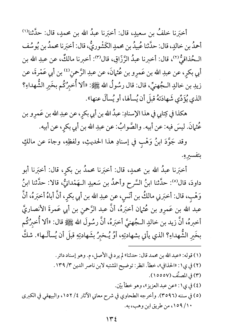 أخبَرنا عبدُ اللَّه بن محمدٍ، قال: أخبَرنا محمدُ بن بكرٍ، قال: أخبَرنا أبو داودَ، قال (¬٥): حدَّثنا ابنُ السَّرح وأحمدُ بن سَعيدٍ الهَمْدانيُّ، قالا: حدَّثنا ابنُ وَهْبٍ، قال: أخبَرني مالكُ بن أَسٍ، عن عبدِ اللَّه بن أبي بكرٍ، أنَّ أباهُ أخبَرهُ، أنَّ عبد اللَّه بن عَمرِو بن عُثمان أخبَرهُ، أنَّ عبد الرحمنِ بن أبي عَمرةَ الأنصاريَّ أخبرهُ، أنَّ زيد بن خالدٍ الجُهنيَّ أخبَرهُ، أنَّ رسُولَ اللَّه -صلى اللَّه عليه وسلم- قال: "ألا أُخبِرُكُم بخَيرِ الشُّهداءِ؟ الذي يأتي بشهادتِهِ، أوُ يُخبِرُ بشَهادتِهِ قبلَ أن يُسألَها". شكَّ