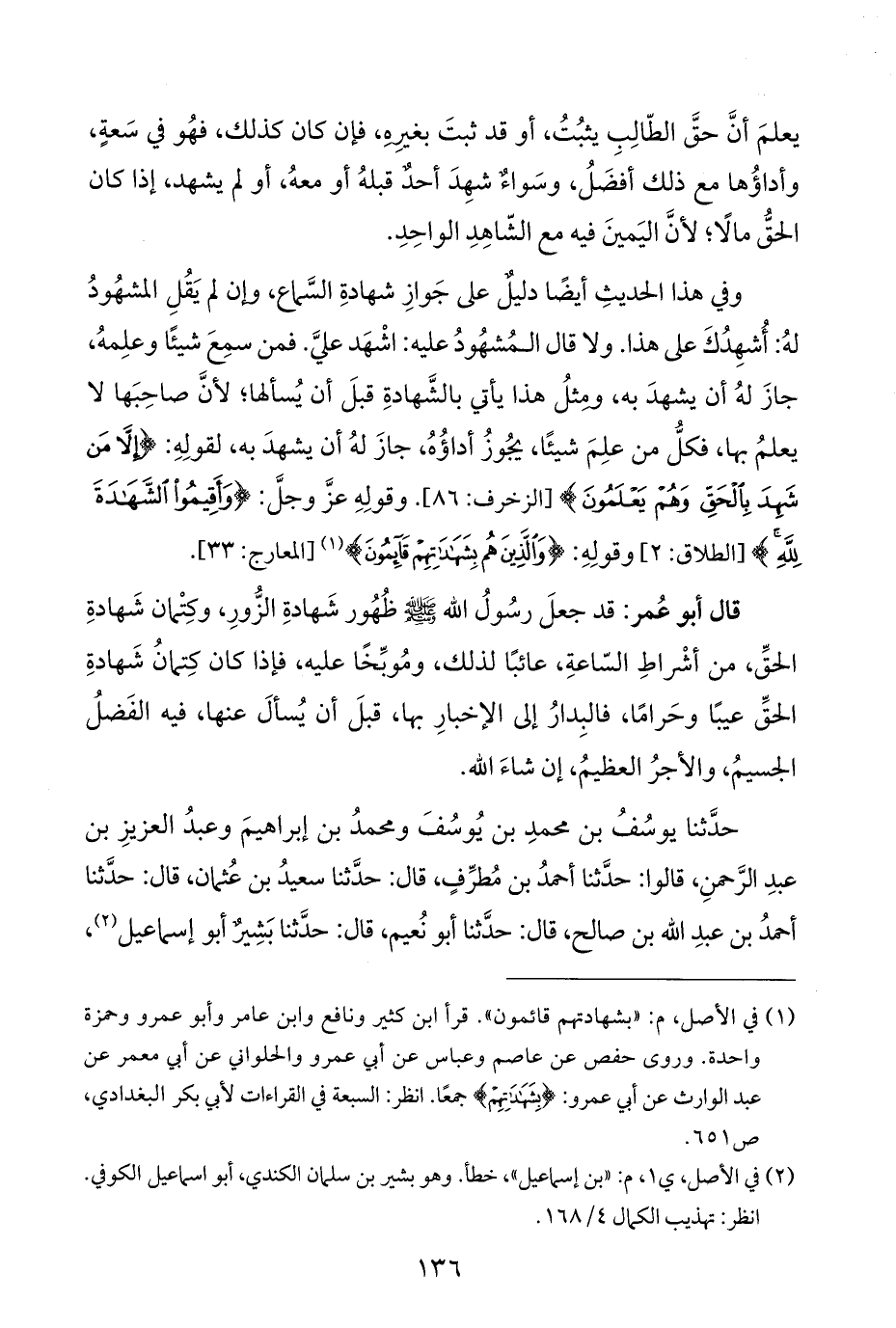 قال أبو عُمر: قد جعلَ رسُولُ اللَّه -صلى اللَّه عليه وسلم- ظُهُور شَهادةِ الزُّورِ، وكِتْمان شَهادةِ الحقِّ، من أشْراطِ السّاعةِ، عائبًا لذلك، ومُوبِّخًا عليه، فإذا كان كِتمانُ شَهادةِ الحقِّ عيبًا وحَرامًا، فالبِدارُ إلى الإخبارِ بها، قبلَ أن يُسألَ عنها، فيه الفَضلُ الجسيمُ، والأجرُ العظيمُ، إن شاءَ اللَّه.