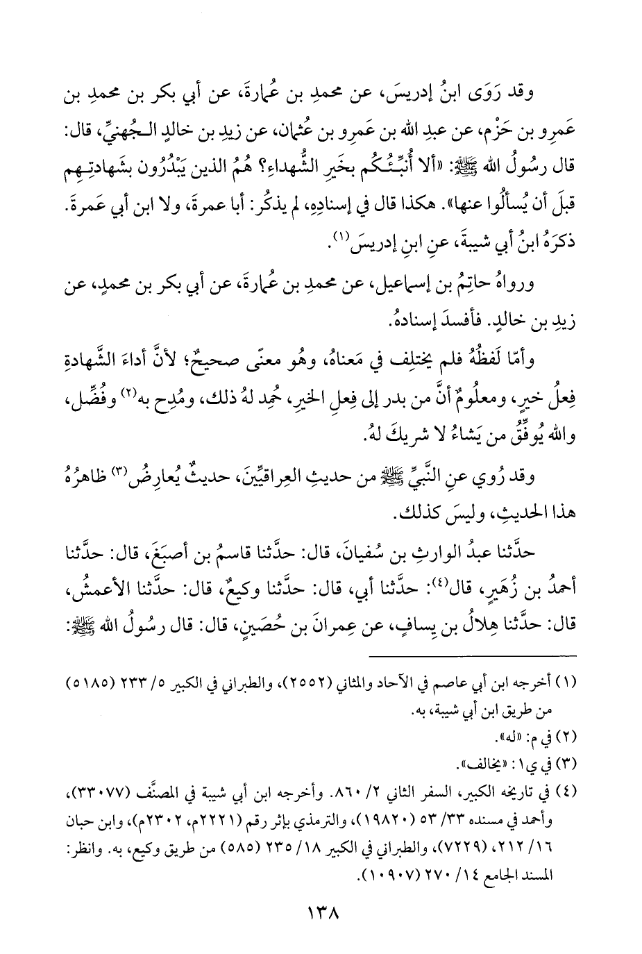 وقد رَوَى ابنُ إدريسَ، عن محمدِ بن عُمارةَ، عن أبي بكر بن محمدِ بن عَمرِو بن حَزْم، عن عبدِ اللَّه بن عَمرِو بن عُثمان، عن زيدِ بن خالدٍ الجُهنيِّ، قال: قال رسُولُ اللَّه -صلى اللَّه عليه وسلم-: "ألا أُنبِّئُكُم بخَيرِ الشُّهداءِ؟ هُمُ الذين يَبْدُرُون بشَهادتِهِم قبلَ أن يُسألُوا عنها". هكذا قال في إسنادِهِ، لم يذكُر: أبا عمرةَ، ولا ابن أبي عَمرةَ. ذكرَهُ ابنُ أبي شيبةَ، عنِ ابنِ إدريسَ (¬١).
