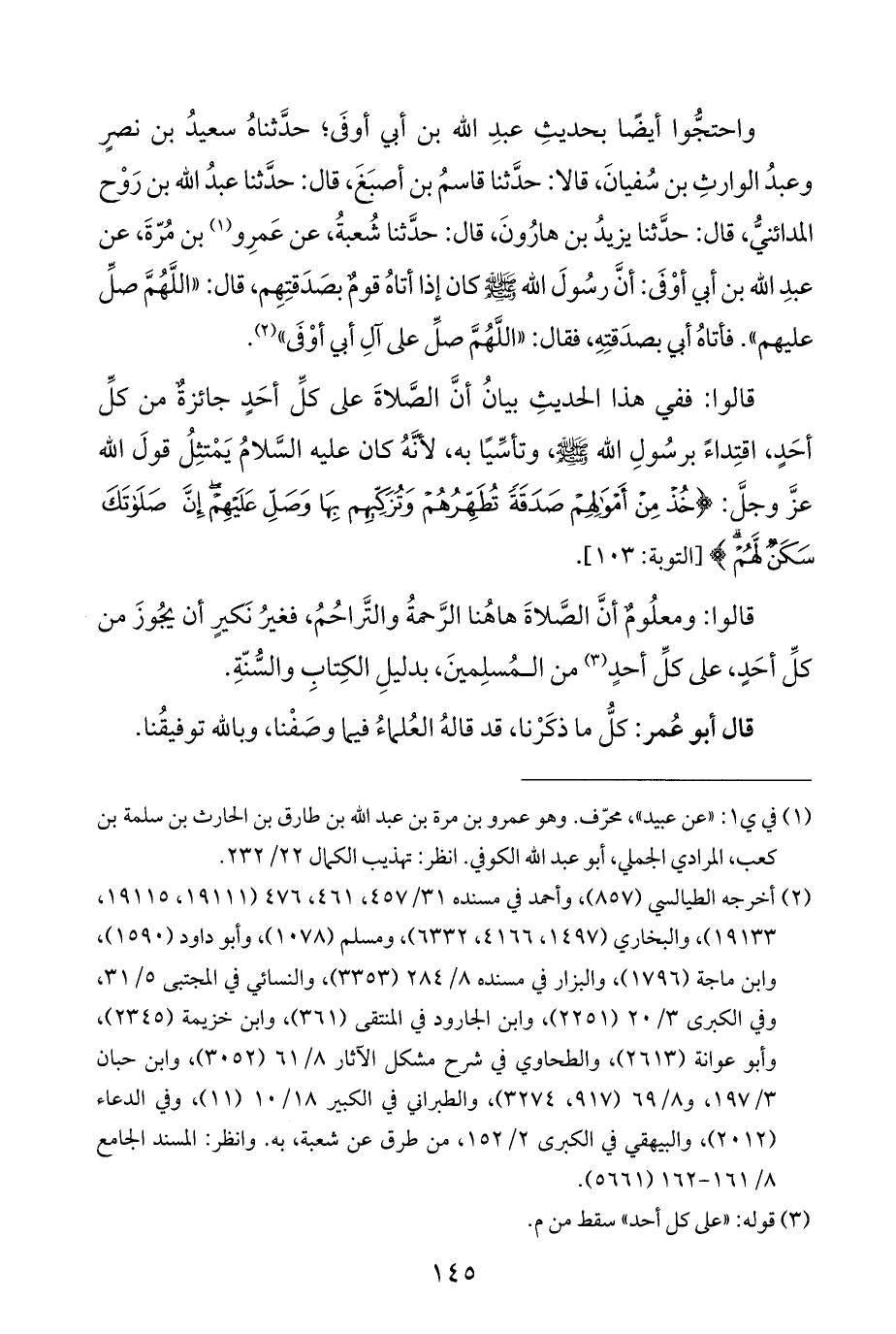 واحتجُّوا أيضًا بحديثِ عبدِ اللَّه بن أبي أوفَى؛ حدَّثناهُ سعيدُ بن نصرٍ وعبدُ الوارثِ بن سُفيانَ، قالا: حدَّثنا قاسمُ بن أصبَغَ، قال: حدَّثنا عبدُ اللَّه بن رَوْح المدائنيُّ، قال: حدَّثنا يزيدُ بن هارُونَ، قال: حدَّثنا شُعبةُ، عن عَمرِو (¬١) بن مُرّةَ، عن عبدِ اللَّه بن أبي أوْفَى: أنَّ رسُولَ اللَّه -صلى اللَّه عليه وسلم- كان إذا أتاهُ قومٌ بصَدَقتِهِم، قال: "اللَّهُمَّ صلِّ عليهم". فأتاهُ أبي بصدَقتِهِ، فقال: "اللَّهُمَّ صلِّ على آلِ أبي أوْفَى" (¬٢).