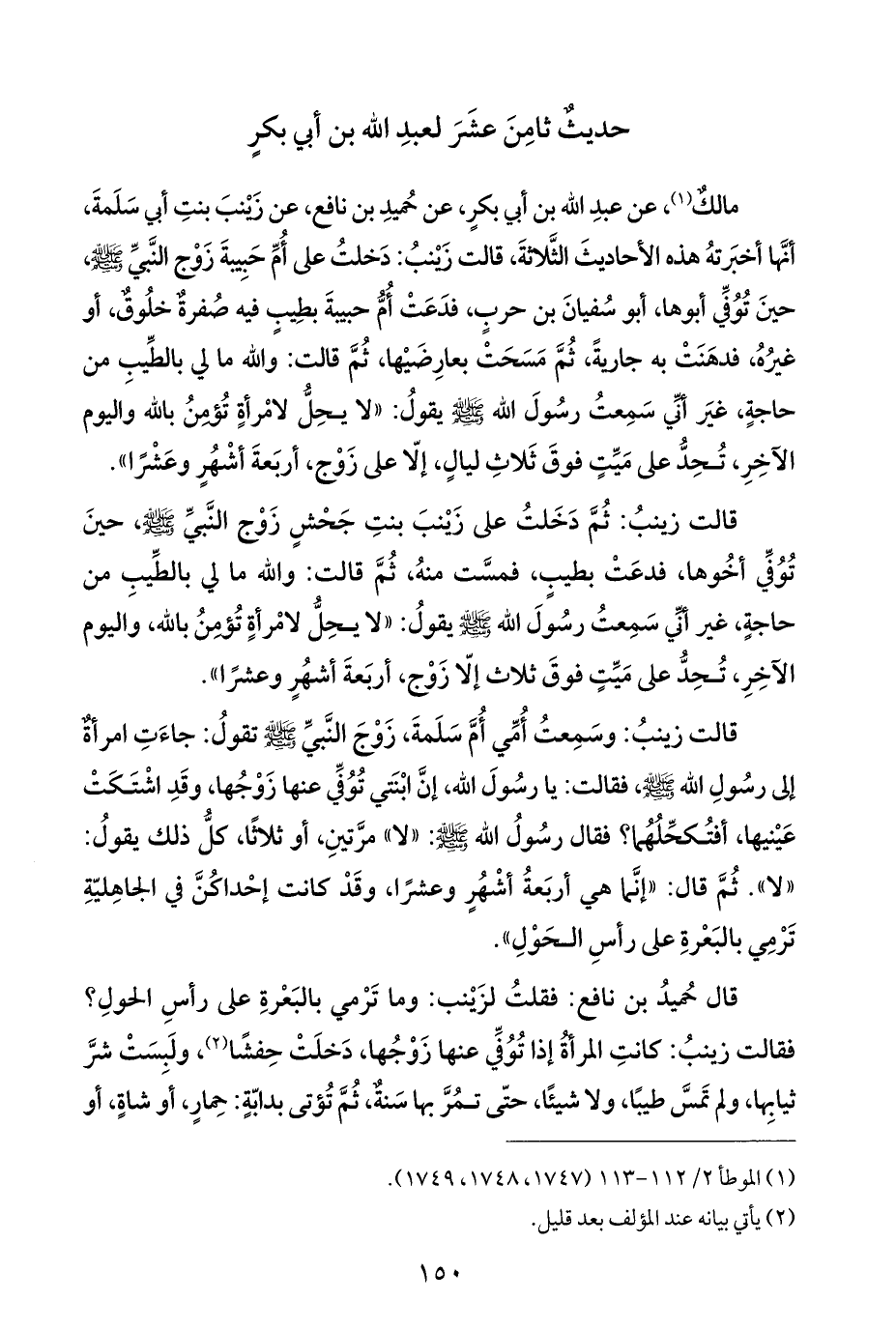 مالكٌ (¬١)، عن عبدِ اللَّه بن أبي بكرٍ، عن حُميدِ بن نافع، عن زَيْنبَ بنتِ أبي سَلَمةَ، أنَّها أخبَرتهُ هذه الأحاديثَ الثَّلاثةَ، قالت زَيْنبُ: دَخلتُ على أمِّ حَبِيبةَ زَوْج النَّبيِّ -صلى اللَّه عليه وسلم-، حينَ تُوُفِّي أبوها، أبو سُفيانَ بن حربٍ، فدَعَتْ أُمُّ حبيبةَ بطِيبٍ فيه صُفرةٌ خلُوقٌ، أو غيرُهُ، فدهَنَتْ به جاريةً، ثُمَّ مَسَحَتْ بعارِضَيْها، ثُمَّ قالت: واللَّه ما لي بالطِّيبِ من حاجةٍ، غيَر أنِّي سَمِعتُ رسُولَ اللَّه -صلى اللَّه عليه وسلم- يقوُل: "لا يحِلُّ لامْرأةٍ تُؤمِنُ باللَّه واليوم الآخِرِ، تُحِدُّ على مَيِّتٍ فوقَ ثَلاثِ ليالٍ، إلّا على زَوْج، أربَعةَ أشْهُرٍ وعَشْرًا".