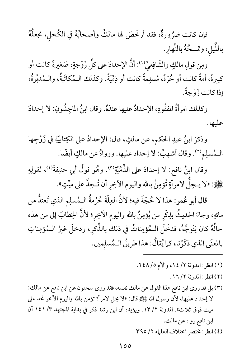 (¬٣) بل قد روى ابن نافع هذا القول عن مالك نفسه، فقد روى سحنون عن ابن نافع عن مالك: لا إحداد عليها، لأن رسول اللَّه -صلى اللَّه عليه وسلم- قال: "لا يحل لامرأة تؤمن باللَّه واليوم الاخر تحد على ميت فوق ثلاث". المدونة ٢/ ١٣. ويؤيده أن ابن رشد ذكر في بداية المجتهد ٣/ ١٤١ أن ابن نافع رواه عن مالك.