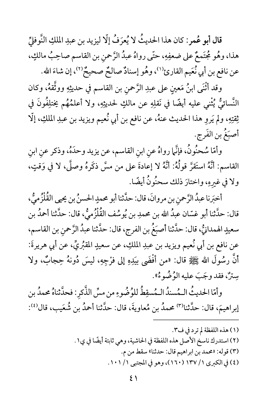 أخبَرنا عبدُ الرَّحمنِ بن مروانَ، قال: حدَّثنا أبو محمدٍ الحسنُ بن يحيى القُلْزُميُّ، قال: حدَّثنا أبو غسّان عبدُ اللَّه بن محمدِ بن يُوسُف القُلْزُميُّ، قال: حدَّثنا أحمدُ بن سعيدٍ الهمدانيُّ، قال: حدَّثنا أصبَغُ بن الفرج، قال: حدَّثنا عبدُ الرَّحمنِ بن القاسم، عن نافع بن أبي نُعيم ويزيد بن عبدِ الملكِ، عن سعيدٍ المقبُريِّ، عن أبي هريرةَ: أنَّ رسولَ اللَّه -صلى اللَّه عليه وسلم- قال: "من أفْضَى بيَدِهِ إلى فرْجِهِ، ليسَ دُونهُ حِجابٌ، ولا سِترٌ، فقد وجَبَ عليه الوُضُوءُ".