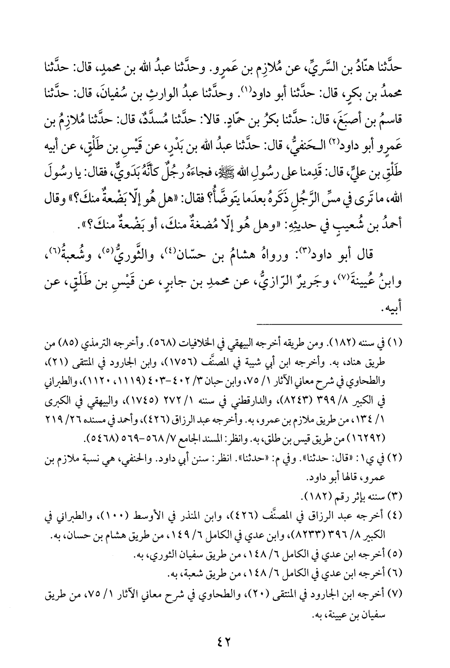 حدَّثنا هنّادُ بن السَّريِّ، عن مُلازِم بن عَمرٍو. وحدَّثنا عبدُ اللَّه بن محمدٍ، قال: حدَّثنا محمدُ بن بكرٍ، قال: حدَّثنا أبو داود (¬١). وحدَّثنا عبدُ الوارثِ بن سُفيانَ، قال: حدَّثنا قاسمُ بن أصبَغَ، قال: حدَّثنا بكرُ بن حمّادٍ. قالا: حدَّثنا مُسدَّدٌ، قال: حدَّثنا مُلازِمُ بن عَمرٍو أبو داود (¬٢) الحَنفيُّ، قال: حدَّثنا عبدُ اللَّه بن بَدْرٍ، عن قَيْسِ بن طَلْقٍ، عن أبيه طَلْقِ بن عليٍّ، قال: قَدِمنا على رسُولِ اللَّه -صلى اللَّه عليه وسلم-، فجاءَهُ رجُل كأنَّهُ بَدَويٌّ، فقال: يا رسُولَ اللَّه، ما تَرى في مسِّ الرَّجُلِ ذَكَرهُ بعدَما يتَوضَّأُ؟ فقال: "هل هُو إلّا بَضْعةٌ منكَ؟ " وقال أحمدُ بن شُعيبٍ في حديثِهِ: "وهل هُو إلّا مُضغةٌ منكَ، أو بَضْعةٌ منكَ؟ ".
