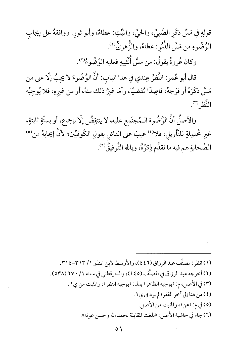 قال أبو عُمر: النَّظرُ عِندي في هذا البابِ: أنَّ الوُضُوءَ لا يجِبُ إلّا على من مَسَّ ذكَرَهُ أو فرْجهُ، قاصِدًا مُفضيًا، وأمّا غيرُ ذلك منهُ، أو من غيرِهِ، فلا يُوجِبُه النَّظر (¬٣).