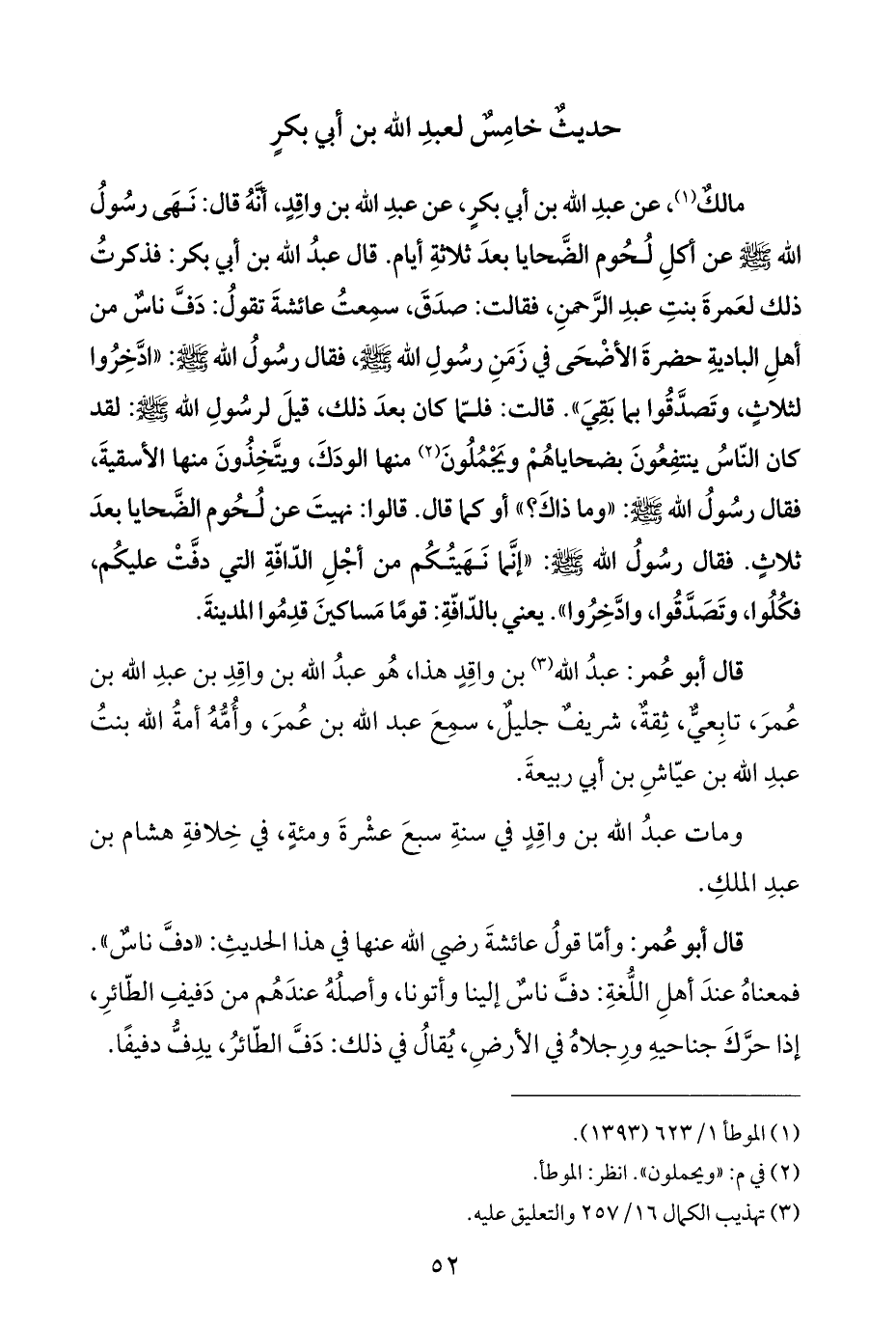 مالكٌ (¬١)، عن عبدِ اللَّه بن أبي بكرٍ، عن عبدِ اللَّه بن واقِدٍ، أنَّهُ قال: نَهَى رسُولُ اللَّه -صلى اللَّه عليه وسلم- عن أكلِ لُحُوم الضَّحايا بعدَ ثلاثةِ أيام. قال عبدُ اللَّه بن أبي بكر: فذكرتُ ذلك لعَمرةَ بنتِ عبدِ الرَّحمنِ، فقالت: صدَقَ، سمِعتُ عائشةَ تقولُ: دَفَّ ناسٌ من أهلِ الباديةِ حضرةَ الأضْحَى في زَمَنِ رسُولِ اللَّه -صلى اللَّه عليه وسلم-، فقال رسُولُ اللَّه -صلى اللَّه عليه وسلم-: "ادَّخِرُوا لثلاثٍ، وتَصدَّقُوا بما بَقِيَ". قالت: فلمّا كان بعدَ ذلك، قيلَ لرسُولِ اللَّه -صلى اللَّه عليه وسلم-: لقد كان النّاسُ ينتفِعُونَ بضحاياهُمْ ويَجْمُلُونَ (¬٢) منها الودَكَ، ويتَّخِذُونَ منها الأسقيةَ، فقال رسُولُ اللَّه -صلى اللَّه عليه وسلم-: "وما ذاكَ؟ " أو كما قال. قالوا: نهيتَ عن لُحُوم الضَّحايا بعدَ ثلاثٍ. فقال رسُولُ اللَّه -صلى اللَّه عليه وسلم-: "إنَّما نَهَيتُكُم من أجْلِ الدّافّةِ التي دفَّتْ عليكُم، فكُلُوا، وتَصَدَّقُوا، وادَّخِرُوا". يعني بالدّافّةِ: قومًا مَساكينَ قدِمُوا المدينةَ.