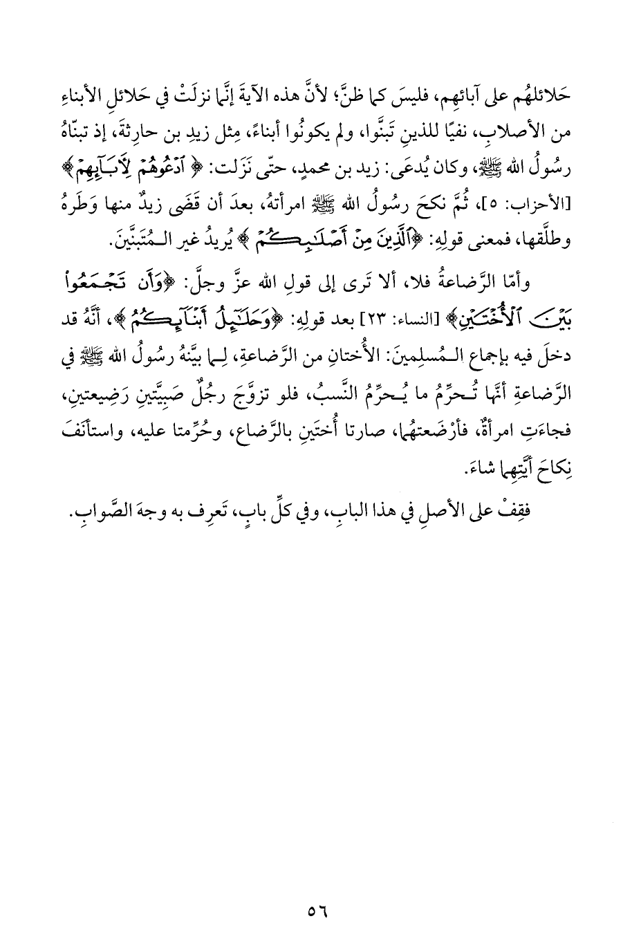 وأمّا الرَّضاعةُ فلا، ألا تَرى إلى قولِ اللَّه عزَّ وجلَّ: {وَأَنْ تَجْمَعُوا بَيْنَ الْأُخْتَيْنِ} [النساء: ٢٣] بعد قولِهِ: {وَحَلَائِلُ أَبْنَائِكُمُ}، أنَّهُ قد دخلَ فيه بإجماع المُسلِمينَ: الأُختانِ من الرَّضاعةِ، لِما بيَّنهُ رسُولُ اللَّه -صلى اللَّه عليه وسلم- في الرَّضاعةِ أنَّها تُحرِّمُ ما يُحرِّمُ النَّسبُ، فلو تزوَّجَ رجُل صَبِيَّتينِ رَضِيعتينِ، فجاءَتِ امرأةٌ، فأرْضَعتهُما، صارتا أُختَينِ بالرَّضاع، وحُرِّمتا عليه، واستأنفَ نِكاحَ أيَّتِهِما شاءَ.