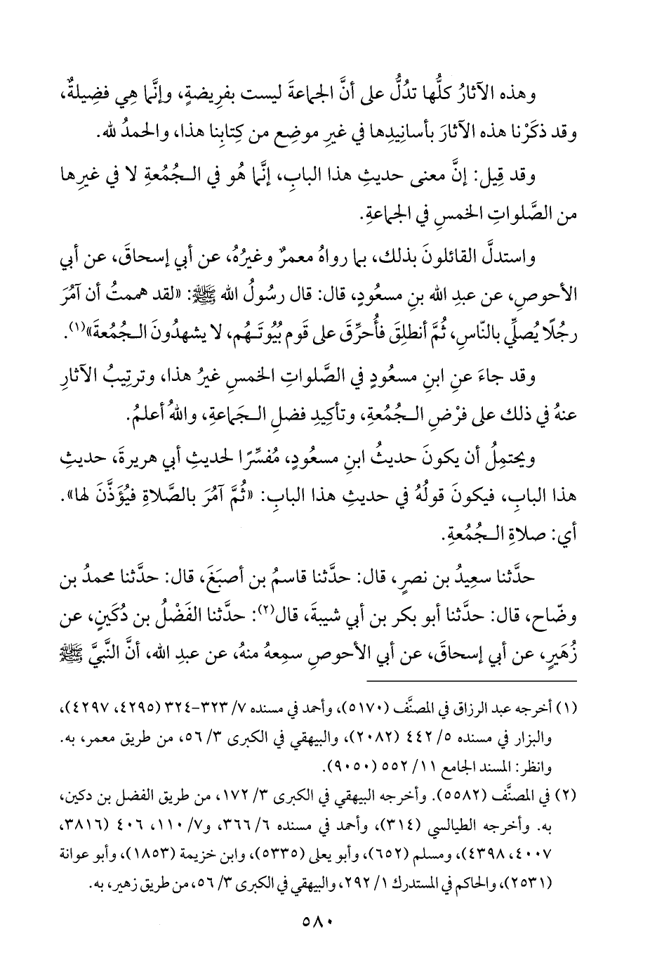 حدَّثنا سعِيدُ بن نصرٍ، قال: حدَّثنا قاسمُ بن أصبَغَ، قال: حدَّثنا محمدُ بن وضّاح، قال: حدَّثنا أبو بكر بن أبي شيبةَ، قال (¬٢): حدَّثنا الفَضْلُ بن دُكَينٍ، عن زُهَيرٍ، عن أبي إسحاقَ، عن أبي الأحوصِ سمِعهُ منهُ، عن عبدِ الله، أنَّ النَّبيَّ - صلى الله عليه وسلم -
