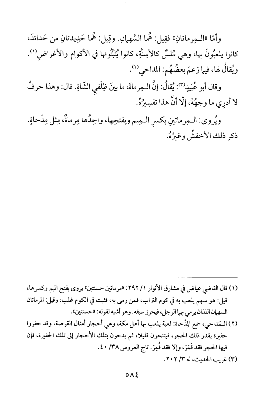 وأمّا "المِرماتانِ" فقِيل: هُما السَّهمانِ. وقِيل: هُما حَدِيدتانِ من حَدائدَ، كانوا يلعبُونَ بها، وهي مُلسٌ كالأسِنَّةِ، كانوا يُثبِّتُونها في الأكوام والأغراضِ (¬١). ويُقالُ لها، فيما زعمَ بعضُهُم: المداحي (¬٢).