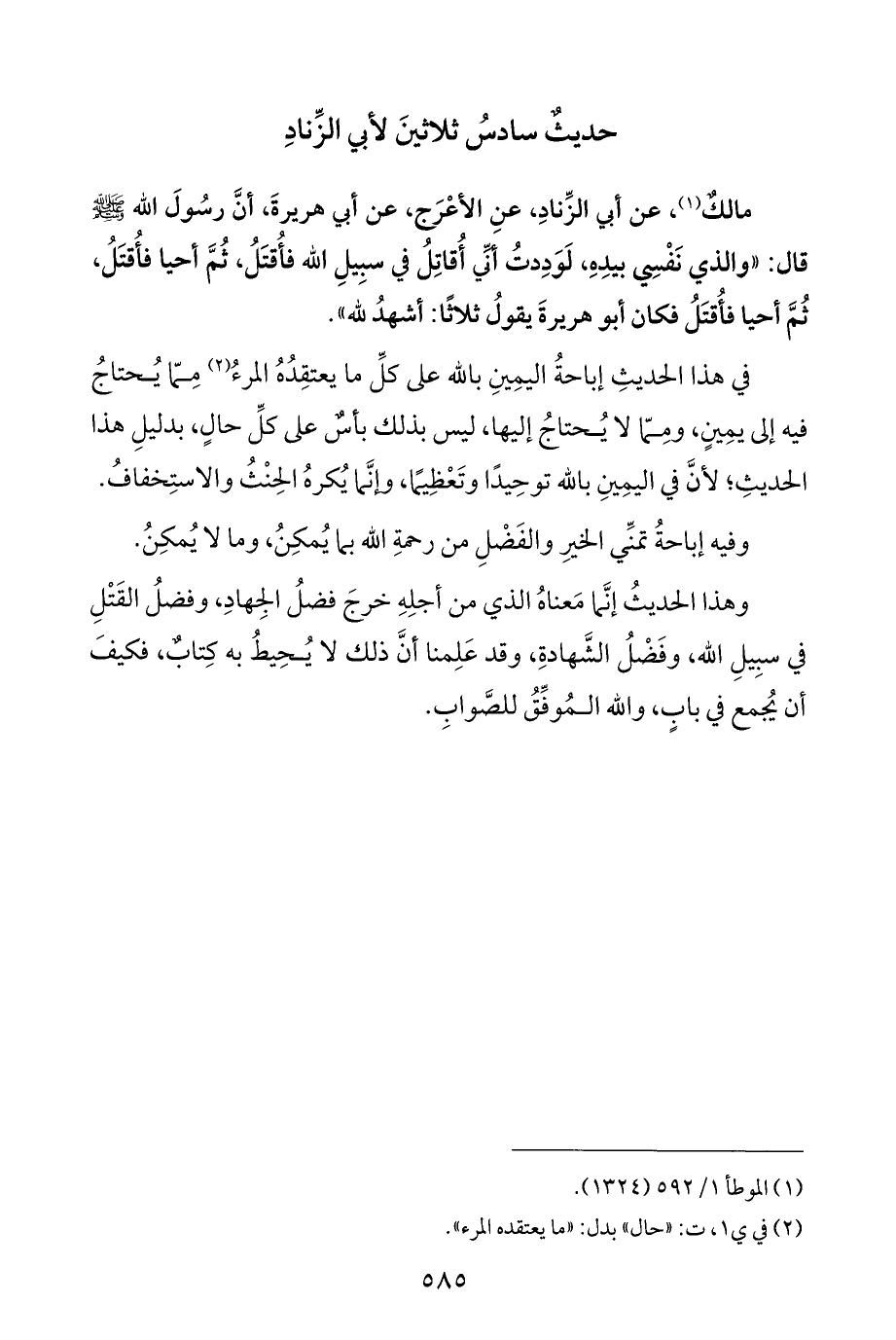 مالكٌ (¬١)، عن أبي الزِّنادِ، عنِ الأعْرَج، عن أبي هريرةَ، أنَّ رسُولَ الله - صلى الله عليه وسلم - قال: "والذي نَفْسِي بيد، لَوَدِدتُ أنِّي أُقاتِلُ في سبِيلِ الله فأُقتَلُ، ثُمَّ أحيا فأُقتَلُ، ثُمَّ أحيا فأُقتَلُ فكان أبو هريرةَ يقولُ ثلاثًا: أشهدُ لله".