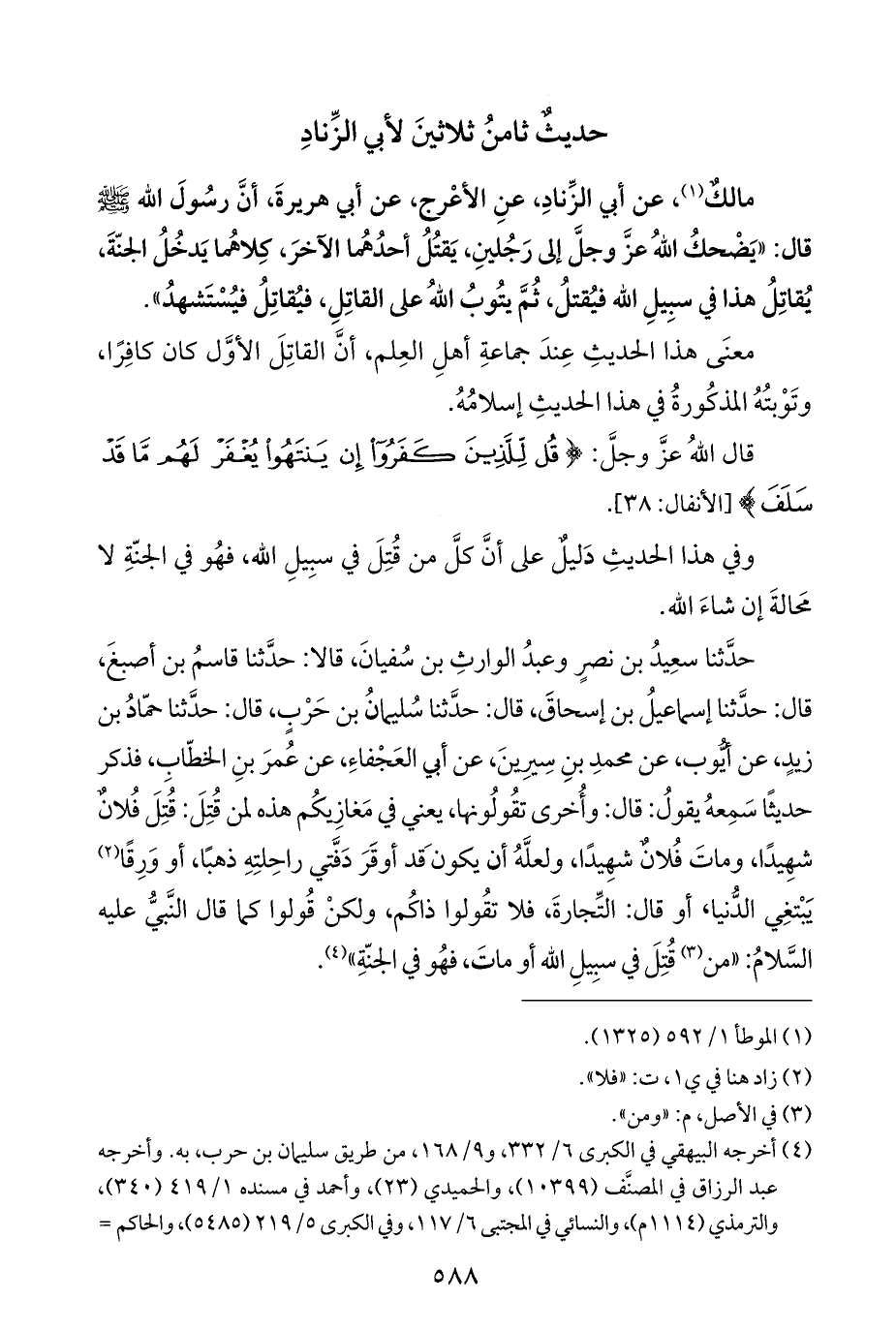 مالكٌ (¬١)، عن أبي الزِّنادِ، عنِ الأعْرج، عن أبي هريرةَ، أنَّ رسُولَ الله - صلى الله عليه وسلم - قال: "يَضْحكُ اللهُ عزَّ وجلَّ إلى رَجُلينِ، يَقتُلُ أحدُهُما الآخرَ، كِلاهُما يَدخُلُ الجنّةَ، يُقاتِلُ هذا في سبِيلِ الله فيُقتلُ، ثُمَّ يتُوبُ اللهُ على القاتِلِ، فيُقاتِلُ فيُسْتَشهدُ".