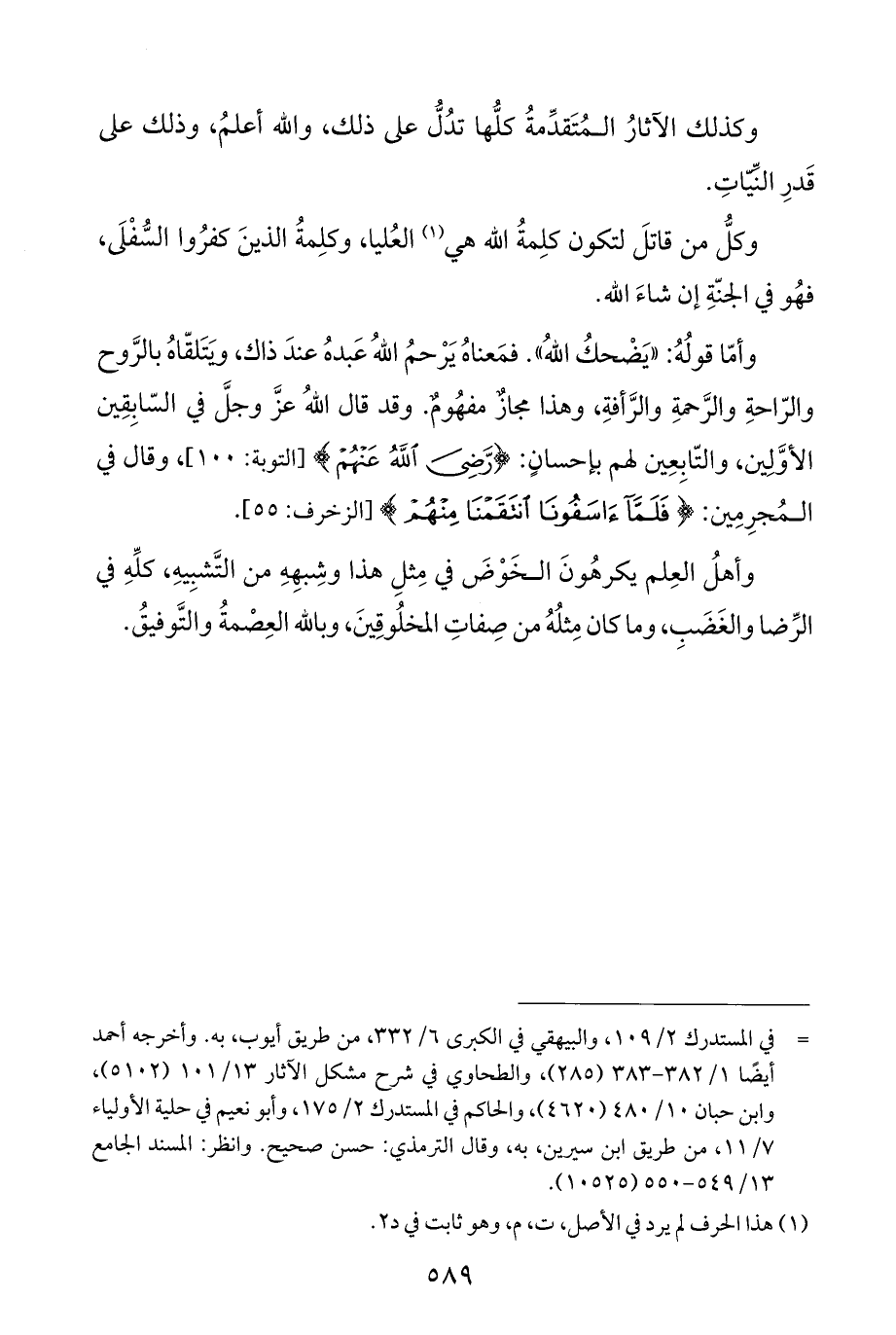وأهلُ العِلم يكرهُونَ الخَوْضَ في مِثلِ هذا وشِبهِهِ من التَّشبِيهِ، كلِّهِ في الرِّضا والغَضَبِ، وما كان مِثلُهُ من صِفاتِ المخلُوقِينَ، وبالله العِصْمةُ والتَّوفيقُ.