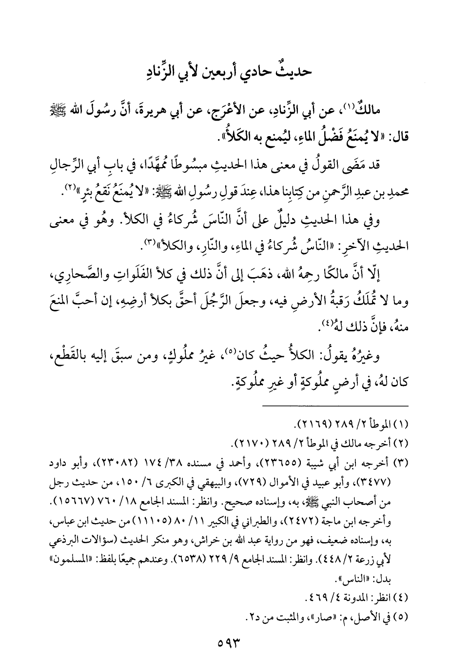 مالكٌ (¬١)، عن أبي الزِّنادِ، عن الأعْرَج، عن أبي هريرةَ، أنَّ رسُولَ الله - صلى الله عليه وسلم - قال: "لا يُمنَعُ فَضْلُ الماءِ، ليُمنع به الكَلأُ".