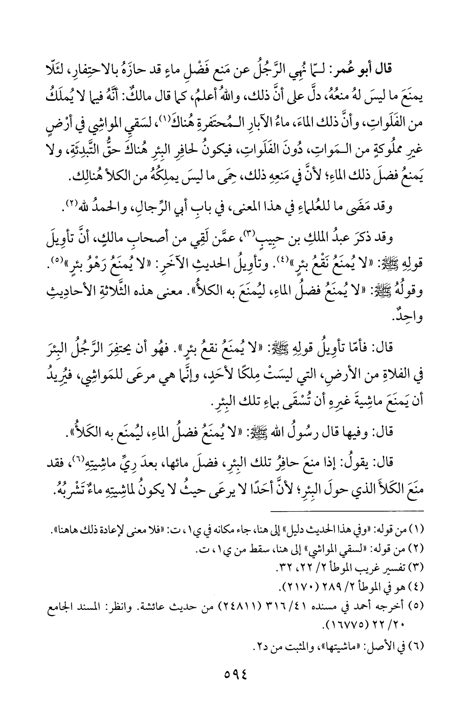 وقد ذكرَ عبدُ الملكِ بن حبِيبٍ (¬٣)، عمَّن لَقِي من أصحابِ مالكٍ، أنَّ تأوِيلَ قولِهِ - صلى الله عليه وسلم -: "لا يُمنَعُ نَقْعُ بئرٍ" (¬٤). وتأوِيلُ الحديثِ الآخَرِ: "لا يُمنَعُ رَهْوُ بئرٍ" (¬٥). وقولُهُ - صلى الله عليه وسلم -: "لا يُمنَعُ فضلُ الماءِ، ليُمنَعَ به الكلأُ". معنى هذه الثَّلاثةِ الأحادِيثِ واحِدٌ.