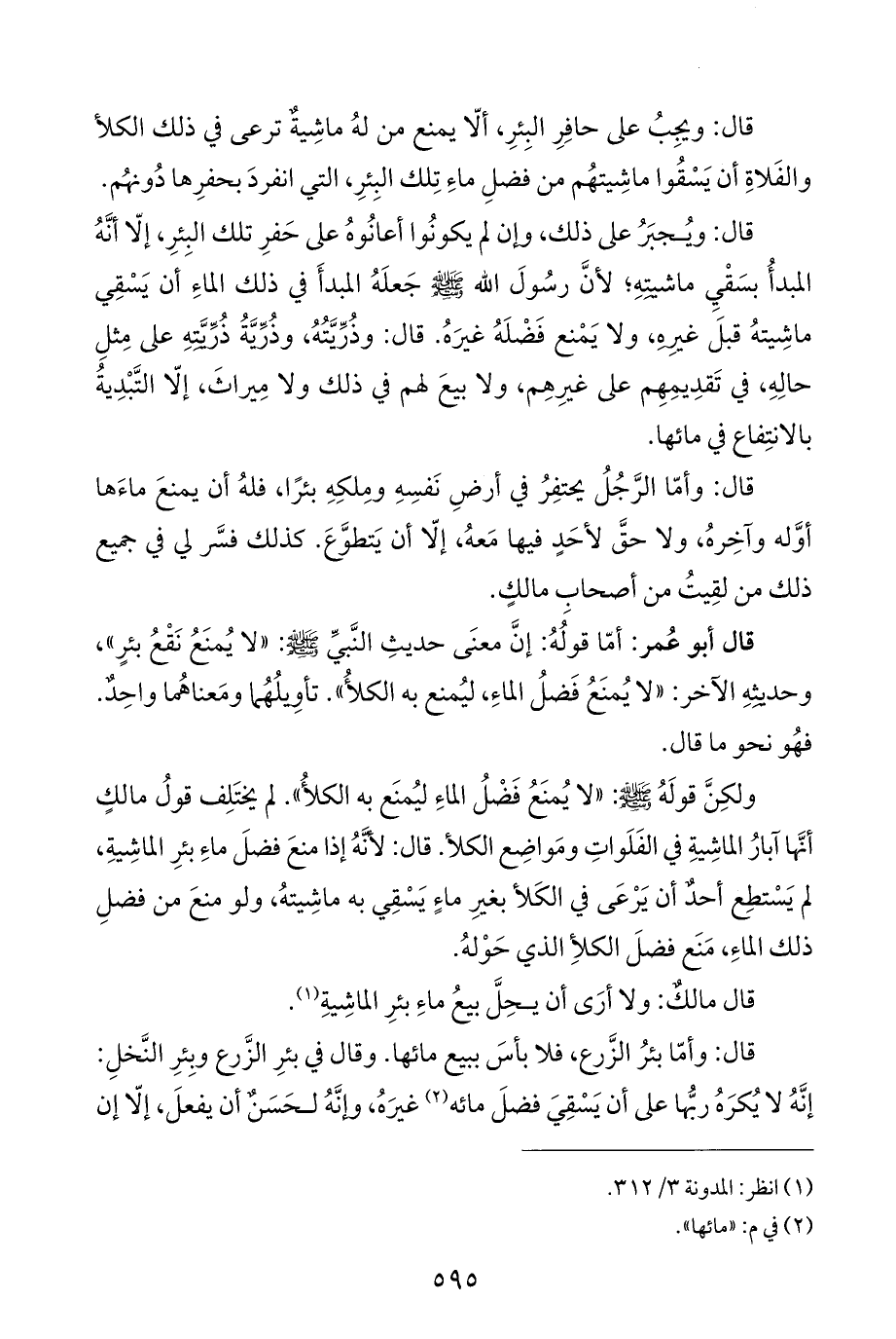 قال: ويجِبُ على حافِرِ البِئرِ، ألّا يمنع من لهُ ماشِيةٌ ترعى في ذلك الكلأ والفَلاةِ أن يَسْقُوا ماشِيتهُم من فضلِ ماءِ تِلك البِئرِ، التي انفردَ بحفرِها دُونهُم.