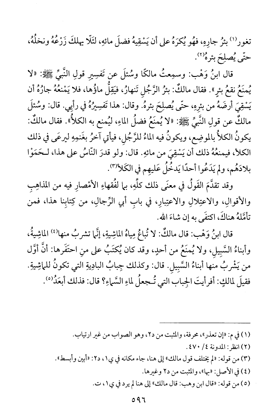 قال ابنُ وَهْب: وسمِعتُ مالكًا وسُئلَ عن تَفسِيرِ قولِ النَّبيِّ - صلى الله عليه وسلم -: "لا يُمنَعُ نقعُ بئرٍ". فقال مالكٌ: بئرُ الرَّجُلِ تَنهارُ، فيَقِلُّ ماؤُها، فلا يَمْنعُهُ جارُهُ أن يَسْقِيَ أرضَهُ من بئرِهِ، حتَّى يُصلِحَ بئرهُ. وقال: هذا تَفسِيرُهُ في رأيِي. قال: وسُئلَ مالكٌ عن قولِ النَّبيِّ - صلى الله عليه وسلم -: "لا يُمنَعُ فضلُ الماءِ، ليُمنع به الكلأُ". فقال مالكٌ: يكونُ الكلأُ بالموضِع، ويكونُ فيه الماءُ للرَّجُلِ، فيأتي آخرُ بغَنمِهِ ليرعَى في ذلك الكلأ، فيمنعُهُ ذلك أن يَسْقِيَ من مائهِ. قال: ولو قدرَ النّاسُ على هذا، لحَمَوْا بلادَهُم، ولم يَدَعُوا أحدًا يَدخُلُ عَليهِم في الكَلأ (¬٣).