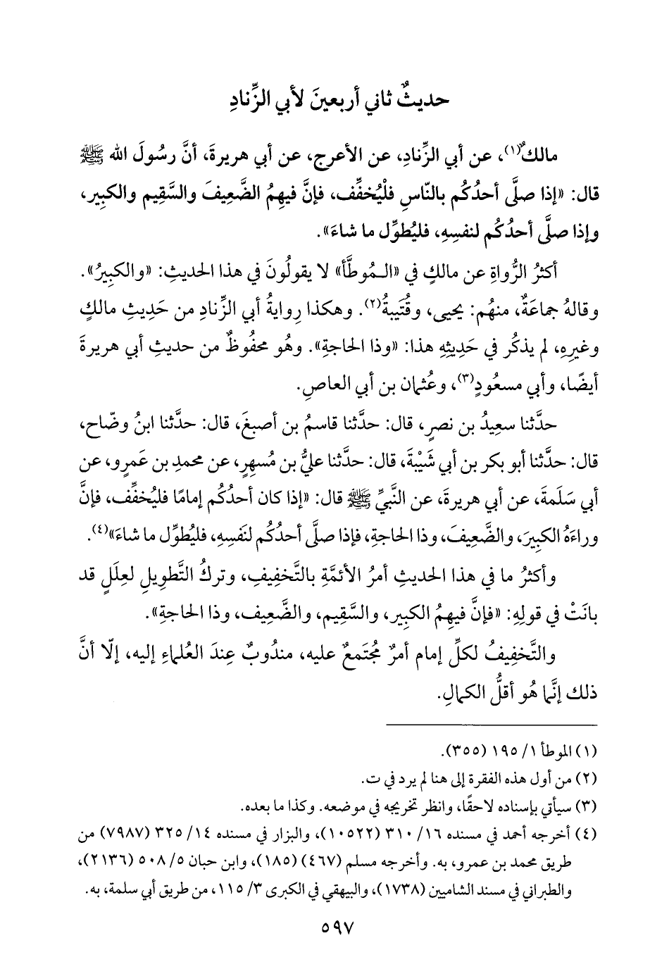 مالكٌ (¬١)، عن أبي الزِّنادِ، عن الأعرج، عن أبي هريرةَ، أنَّ رسُولَ الله - صلى الله عليه وسلم - قال: "إذا صلَّى أحدُكُم بالنّاسِ فلْيُخفِّف، فإنَّ فيهِمُ الضَّعِيفَ والسَّقِيم والكبِير، وإذا صلَّى أحدُكُم لنفسِهِ، فليُطوِّل ما شاءَ".