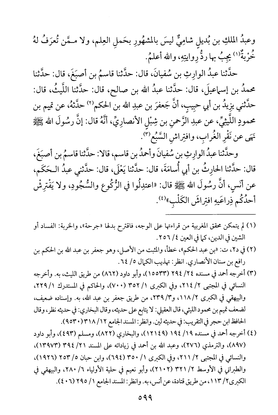 حدَّثنا عبدُ الوارِثِ بن سُفيانَ، قال: حدَّثنا قاسمُ بن أصبَغَ، قال: حدَّثنا محمدُ بن إسماعيلَ، قال: حدَّثنا عبدُ الله بن صالح، قال: حدَّثنا اللَّيثُ، قال: حدَّثني يزِيدُ بن أبي حبِيبٍ، أنَّ جَعفرَ بن عبدِ الله بن الحكم (¬٢) حدَّثهُ، عن تمِيم بن محمودٍ اللَّيثِيِّ، عن عبدِ الرَّحمنِ بن شِبْلٍ الأنصارِيِّ، أنَّهُ قال: إنَّ رسُولَ الله - صلى الله عليه وسلم - نَهَى عن نَقْرِ الغُرابِ، وافتِراشِ السَّبُع (¬٣).