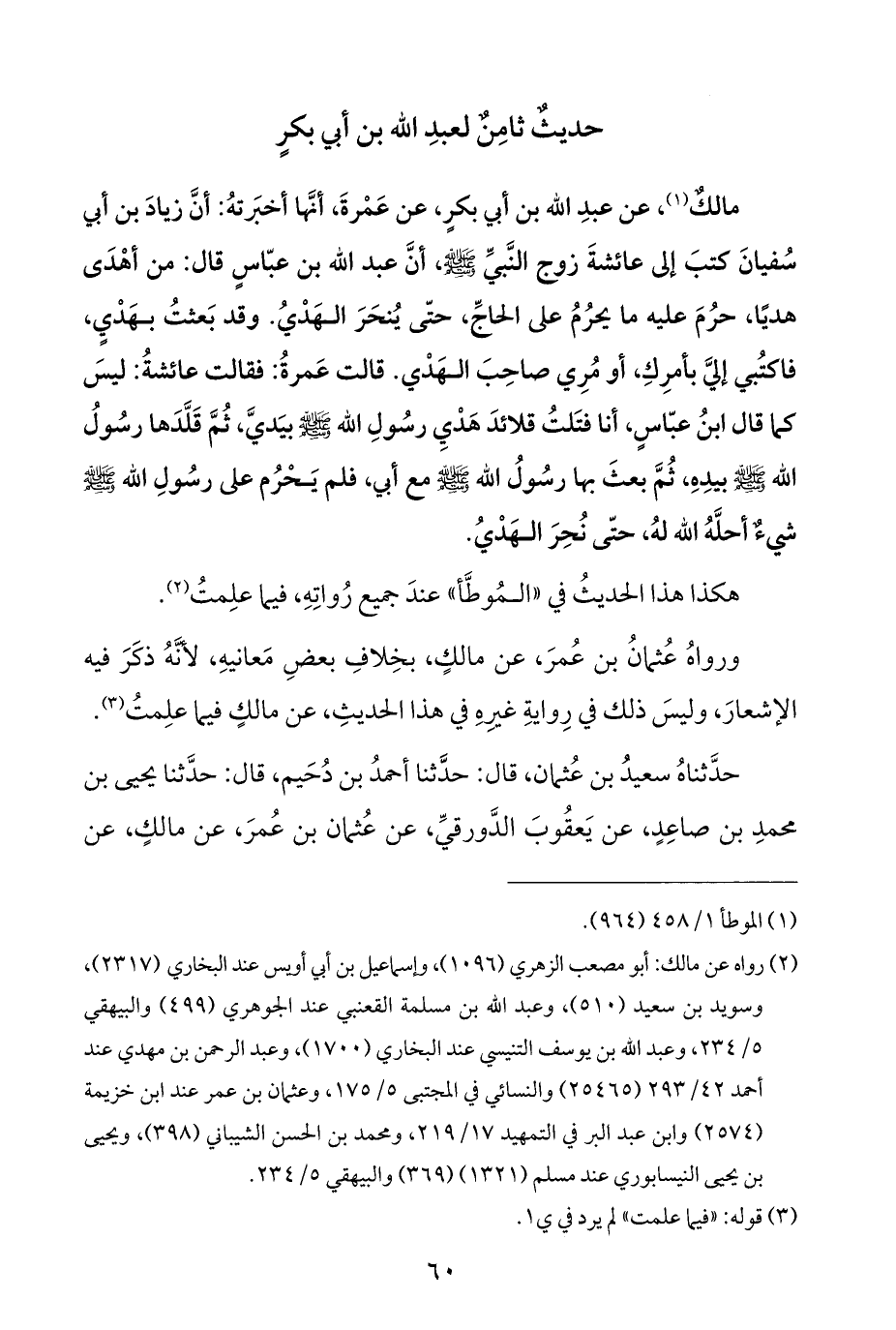 ورواهُ عُثمانُ بن عُمرَ، عن مالكٍ، بخِلافِ بعضِ مَعانيهِ، لأنَّهُ ذكَرَ فيه الإشعارَ، وليسَ ذلك في رِوايةِ غيرِهِ في هذا الحديثِ، عن مالكٍ فيما علِمتُ (¬٣).