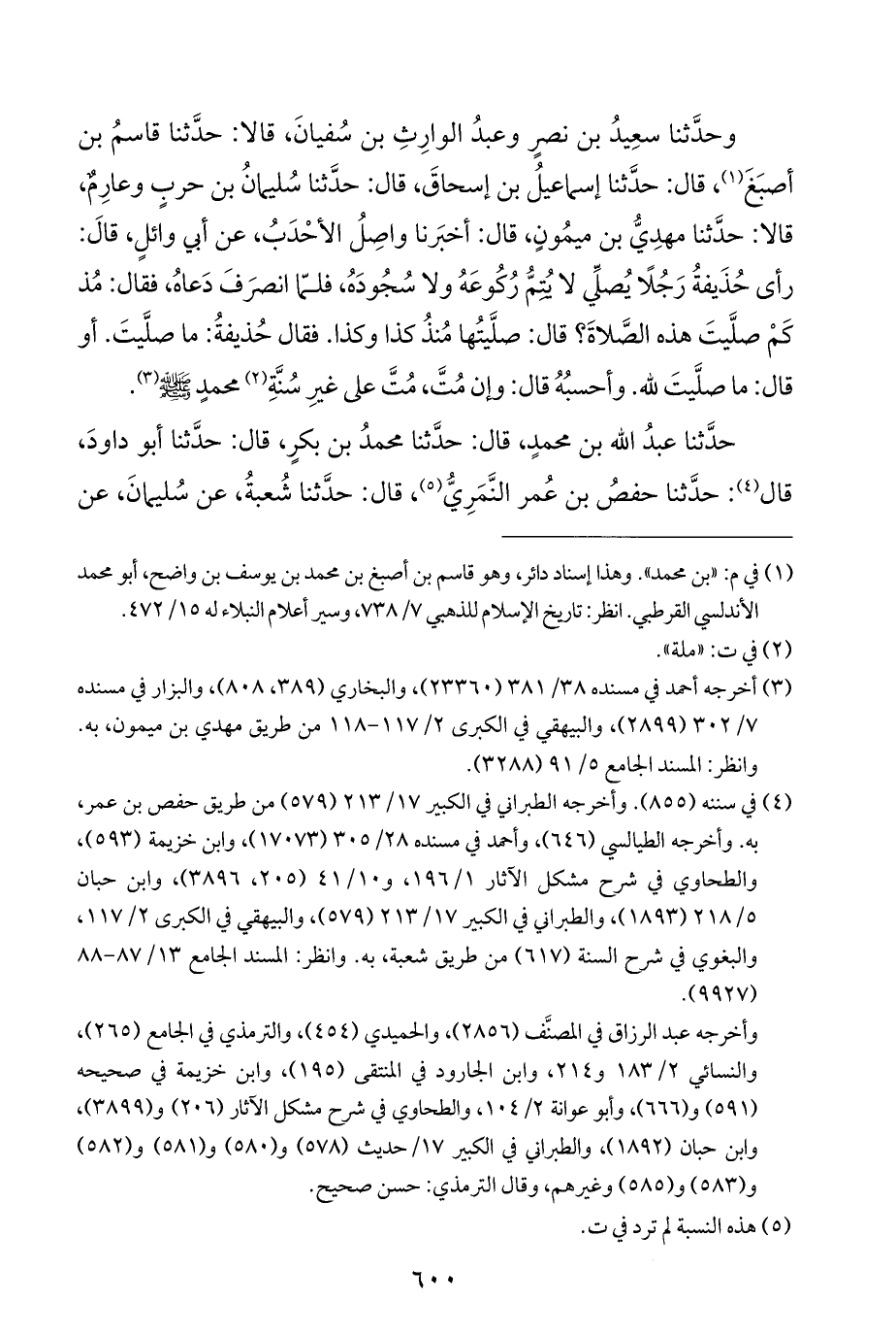 وحدَّثنا سعِيدُ بن نصرٍ وعبدُ الوارِثِ بن سُفيانَ، قالا: حدَّثنا قاسمُ بن أصبَغَ (¬١)، قال: حدَّثنا إسماعيلُ بن إسحاقَ، قال: حدَّثنا سُليمانُ بن حربٍ وعارِمٌ، قالا: حدَّثنا مهدِيُّ بن ميمُونٍ، قال: أخبَرنا واصِلُ الأحْدَبُ، عن أبي وائلٍ، قالَ: رأى حُذَيفةُ رَجُلًا يُصلِّي لا يُتِمُّ رُكُوعَهُ ولا سُجُودَهُ، فلمّا انصرَفَ دَعاهُ، فقال: مُذ كَمْ صلَّيتَ هذه الصَّلاةَ؟ قال: صلَّيتُها مُنذُ كذا وكذا. فقال حُذيفةُ: ما صلَّيتَ. أو قال: ما صلَّيتَ لله. وأحسبُهُ قال: وإن مُتَّ، مُتَّ على غيرِ سُنَّةِ (¬٢) محمدٍ - صلى الله عليه وسلم - (¬٣).