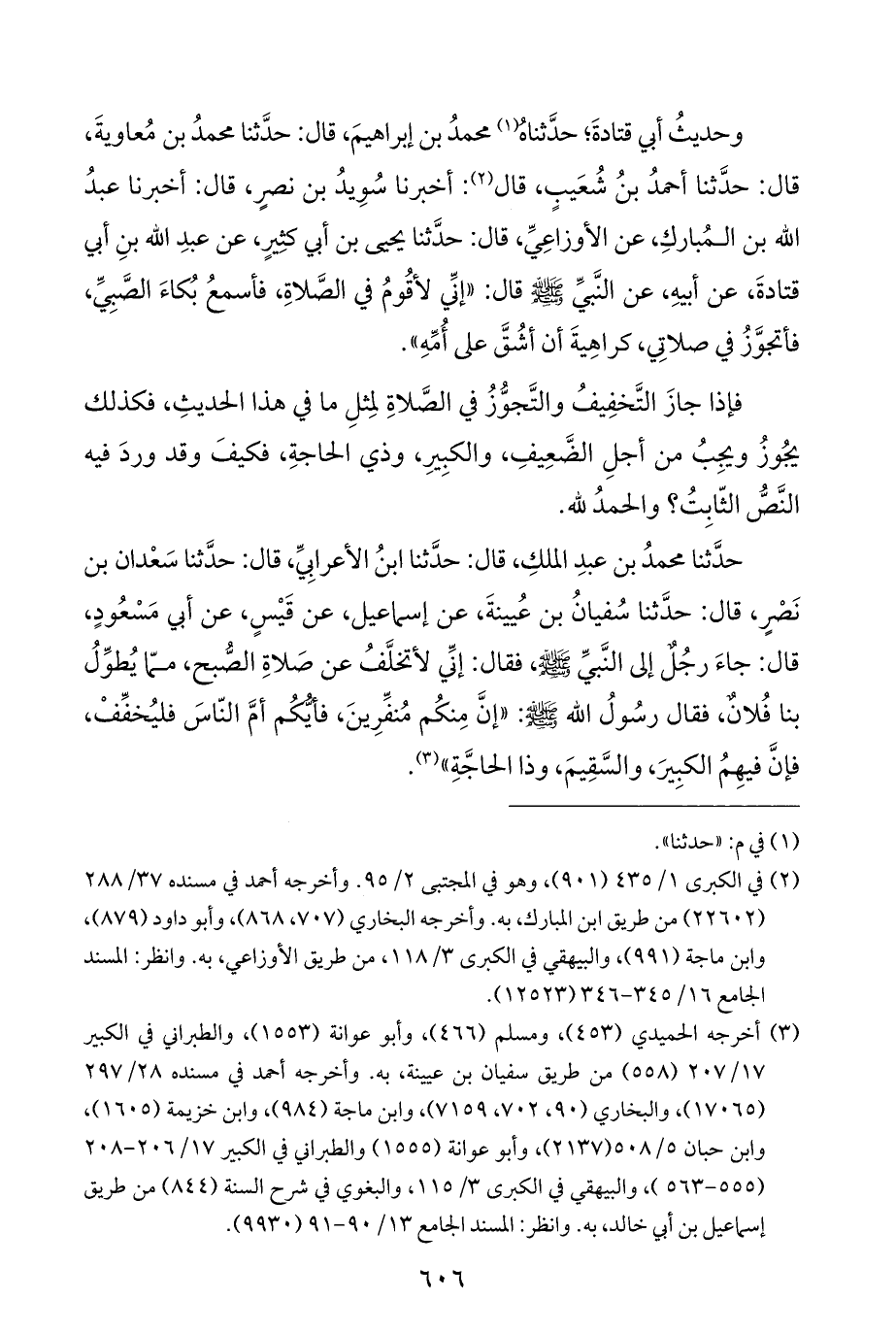 وحديثُ أبي قتادةَ؛ حدَّثناهُ (¬١) محمدُ بن إبراهيمَ، قال: حدَّثنا محمدُ بن مُعاويةَ، قال: حدَّثنا أحمدُ بنُ شُعَيبٍ، قال (¬٢): أخبرنا سُوِيدُ بن نصرٍ، قال: أخبرنا عبدُ الله بن المُباركِ، عن الأوزاعِيِّ، قال: حدَّثنا يحيى بن أبي كثِيرٍ، عن عبدِ الله بنِ أبي قتادةَ، عن أبيهِ، عن النَّبيِّ - صلى الله عليه وسلم - قال: "إنِّي لأقُومُ في الصلاةِ، فأسمعُ بُكاءَ الصَّبِيِّ، فأتجوَّزُ في صلاتِي، كراهِيةَ أن أشُقَّ على أُمِّهِ".