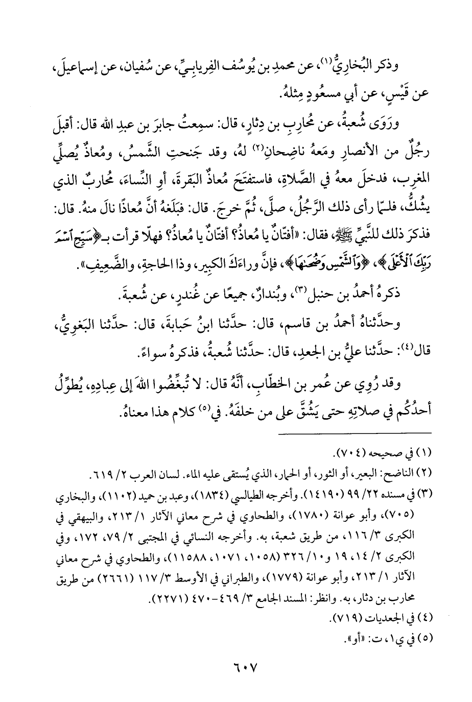 ورَوَى شُعبةُ، عن مُحارِبِ بن دِثارٍ، قال: سمِعتُ جابرَ بن عبدِ الله قال: أقبلَ رجُلٌ من الأنصارِ ومَعهُ ناضِحانِ (¬٢) لهُ، وقد جَنحتِ الشَّمسُ، ومُعاذٌ يُصلِّي المغرِب، فدخلَ معهُ في الصَّلاةِ، فاستفتَحَ مُعاذٌ البَقرةَ، أوِ النِّساءَ، مُحاربٌ الذي يشُكُّ، فلمّا رأى ذلك الرَّجُلُ، صلَّى، ثُمَّ خرجَ. قال: فبَلَغهُ أنَّ مُعاذًا نالَ منهُ. قال: فذكرَ ذلك للنَّبيِّ - صلى الله عليه وسلم -، فقال: "أفتّانٌ يا مُعاذُ؟ أفتّانٌ يا مُعاذُ؟ فهلّا قرأت بـ {سَبِّحِ اسْمَ رَبِّكَ الْأَعْلَى}، {وَالشَّمْسِ وَضُحَاهَا}، فإنَّ وراءَكَ الكبِير، وذا الحاجةِ، والضَّعِيفِ".