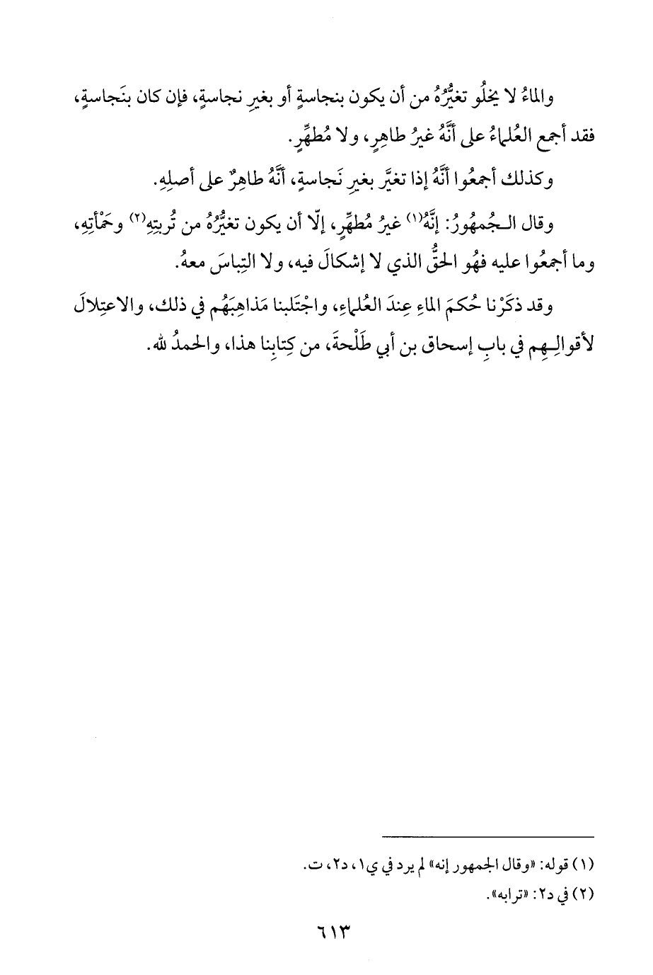 وقد ذكَرْنا حُكمَ الماءِ عِندَ العُلماءِ، واجْتَلبنا مَذاهِبَهُم في ذلك، والاعتِلالَ لأقوالِهِم في بابِ إسحاق بن أبي طَلْحةَ، من كِتابِنا هذا، والحمدُ لله.