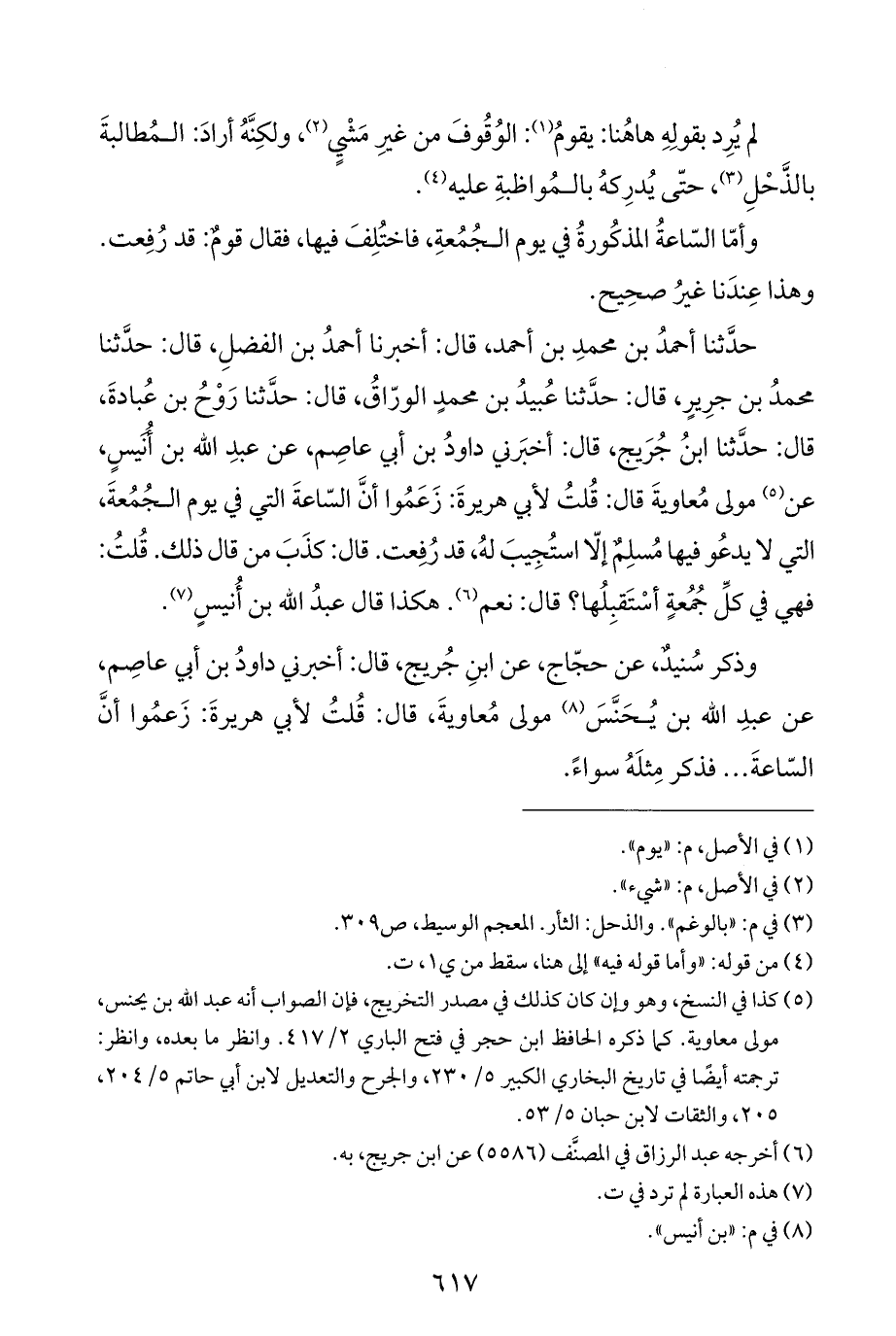 وأمّا السَّاعةُ المذكُورةُ في يوم الجُمُعةِ، فاختُلِفَ فيها، فقال قومٌ: قد رُفِعت. وهذا عِندَنا غيرُ صحِيح.