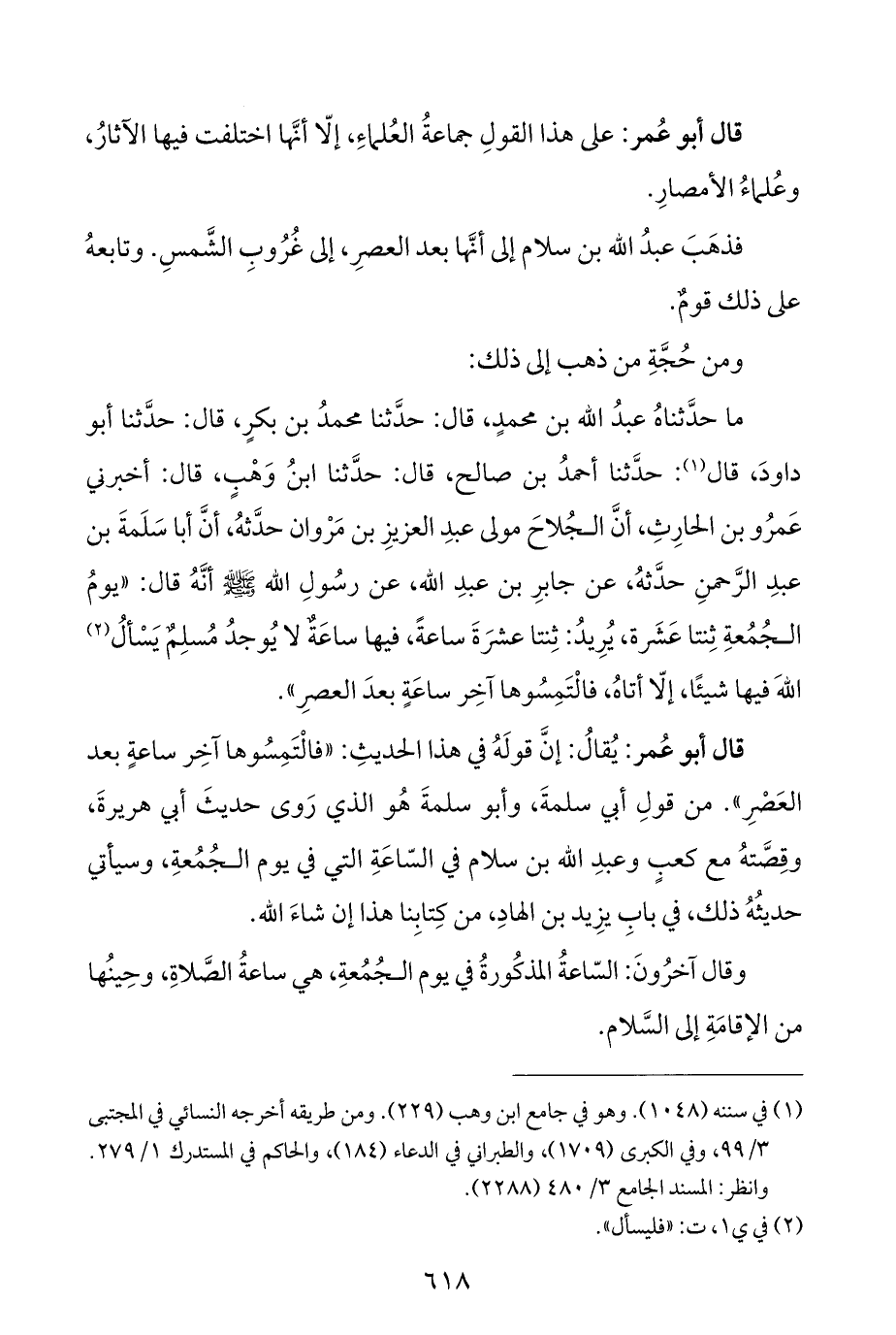 فذهَبَ عبدُ الله بن سلام إلى أنَّها بعد العصرِ، إلى غُرُوبِ الشَّمسِ. وتابعهُ على ذلك قومٌ.
