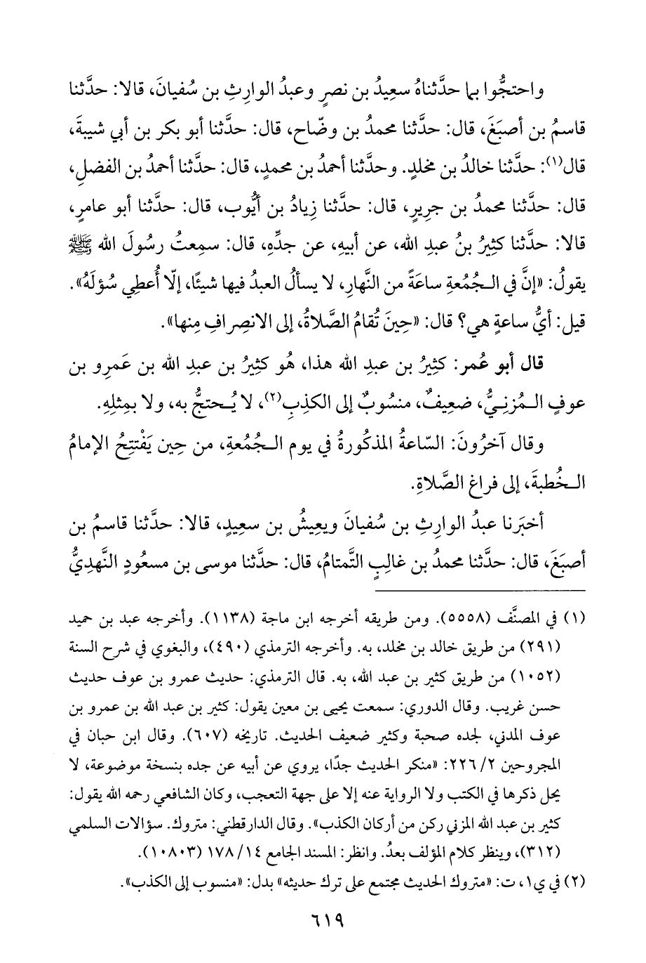 واحتجُّوا بما حدَّثناهُ سعِيدُ بن نصرٍ وعبدُ الوارِثِ بن سُفيانَ، قالا: حدَّثنا قاسمُ بن أصبَغَ، قال: حدَّثنا محمدُ بن وضّاح، قال: حدَّثنا أبو بكر بن أبي شيبةَ، قال (¬١): حدَّثنا خالدُ بن مخلدٍ. وحدَّثنا أحمدُ بن محمدٍ، قال: حدَّثنا أحمدُ بن الفضلِ، قال: حدَّثنا محمدُ بن جرِيرٍ، قال: حدَّثنا زِيادُ بن أيُّوب، قال: حدَّثنا أبو عامرٍ، قالا: حدَّثنا كثِيرُ بنُ عبدِ الله، عن أبيهِ، عن جدِّهِ، قال: سمِعتُ رسُولَ الله - صلى الله عليه وسلم - يقولُ: "إنَّ في الجُمُعةِ ساعَةً من النَّهارِ، لا يسألُ العبدُ فيها شيئًا، إلّا أُعطِي سُؤلَهُ". قيل: أيُّ ساعةٍ هي؟ قال: "حِينَ تُقامُ الصَّلاةُ، إلى الانصِرافِ مِنها".