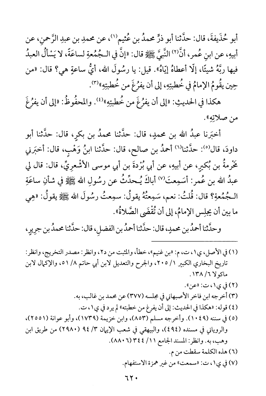 أبو حُذَيفةَ، قال: حدَّثنا أبو ذرٍّ محمدُ بن عُثيم (¬١)، عن محمدِ بن عبدِ الرَّحمنِ، عن أبيهِ، عن ابنِ عُمر، أنَّ (¬٢) النَّبيَّ - صلى الله عليه وسلم - قال: "إنَّ في الجُمُعةِ لساعَةً، لا يَسْألُ العبدُ فيها ربَّهُ شيئًا، إلّا أعطاهُ إيّاهُ". قيل: يا رسُولَ الله، أيُّ ساعةٍ هي؟ قال: "من حِين يقُومُ الإمامُ في خُطبتِهِ، إلى أن يفرُغَ من خُطبتِهِ" (¬٣).