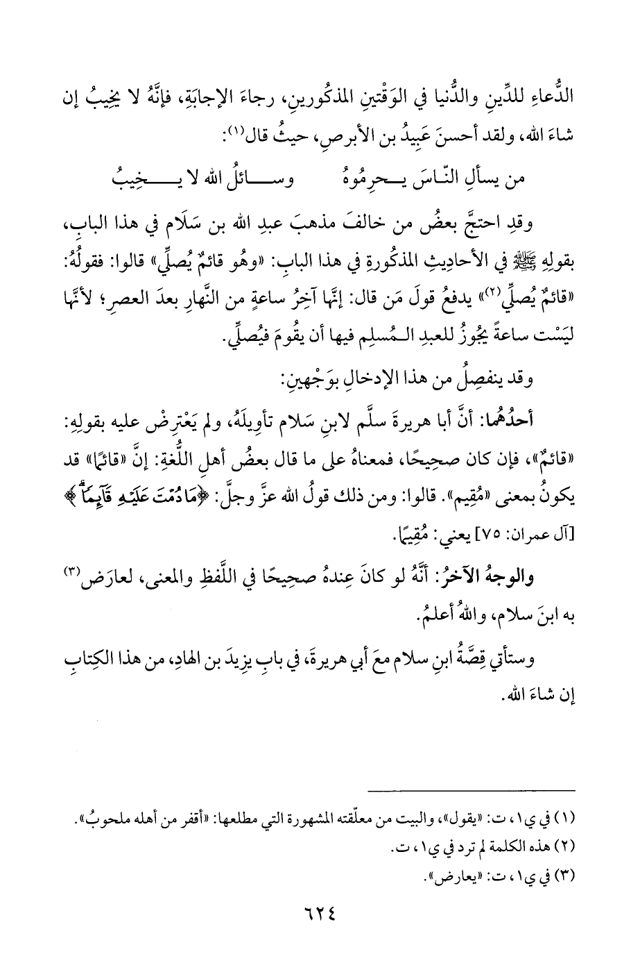 وقدِ احتجَّ بعضُ من خالفَ مذهبَ عبدِ الله بن سَلَام في هذا البابِ، بقولِهِ - صلى الله عليه وسلم - في الأحادِيثِ المذكُور في هذا البابِ: "وهُو قائمٌ يُصلِّي" قالوا: فقولُهُ: "قائمٌ يُصلِّي (¬٢) " يدفعُ قولَ مَن قال: إنَّها آخِرُ ساعةٍ من النَّهارِ بعدَ العصِر؛ لأنَّها ليَسْت ساعةً يجُوزُ للعبدِ المُسلِم فيها أن يقُومَ فيُصلِّي.