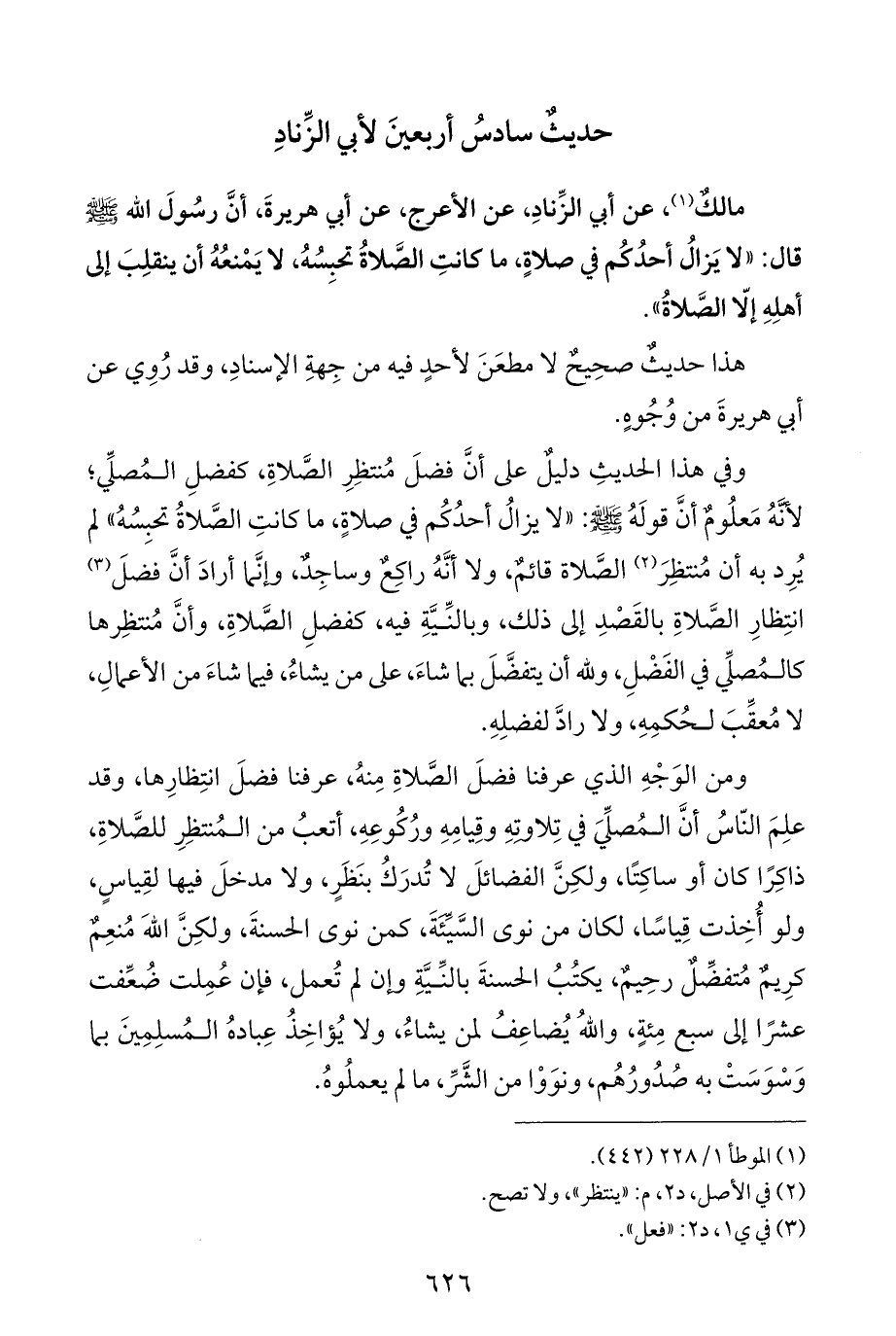 مالكٌ (¬١)، عن أبي الزِّنادِ، عن الأعرج، عن أبي هريرةَ، أنَّ رسُولَ الله - صلى الله عليه وسلم - قال: "لا يَزالُ أحدُكُم في صلاةٍ، ما كانتِ الصَّلاةُ تحبِسُهُ، لا يَمْنعُهُ أن ينقلِبَ إلى أهلِهِ إلّا الصَّلاةُ".